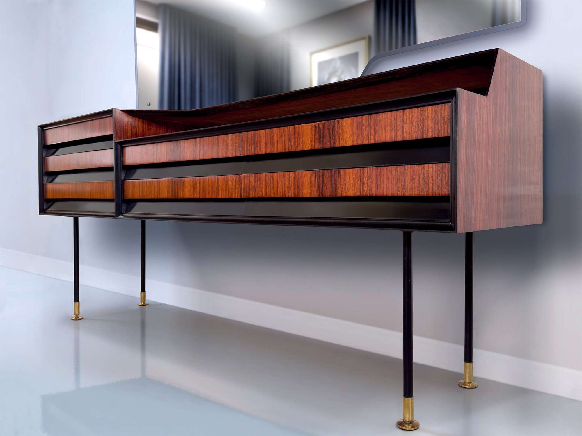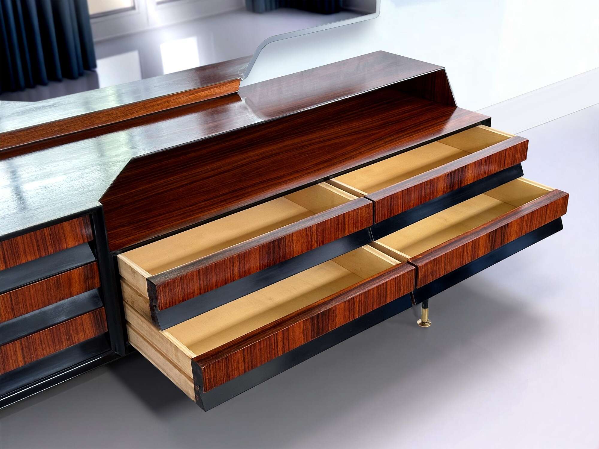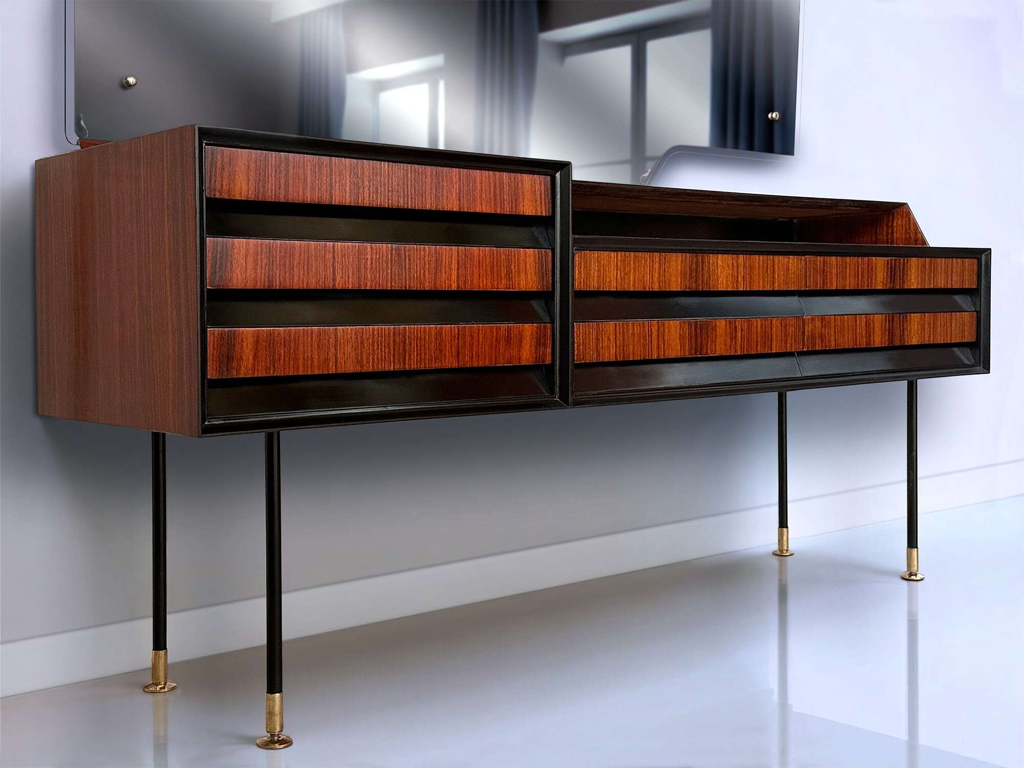 Questa credenza e/o cassettiera italiana con specchio è stata progettata con grande cura da Vittorio Dassi negli anni '50, realizzata con un materiale pregiato come il caldo legno di teak.