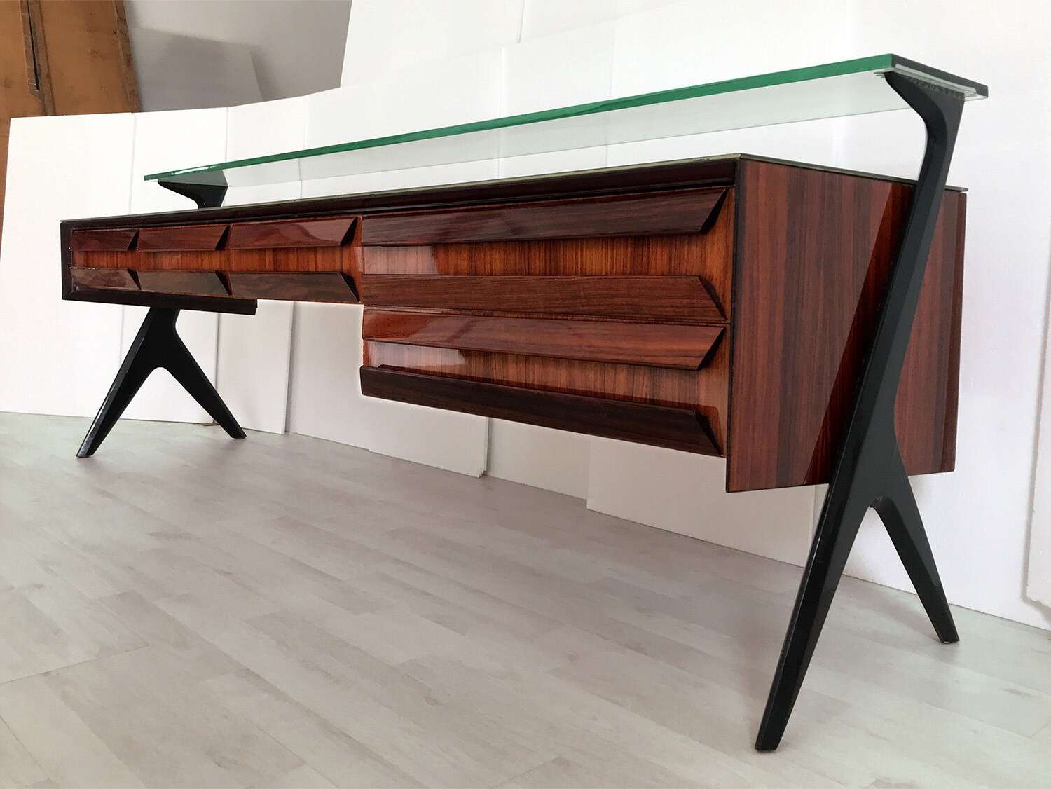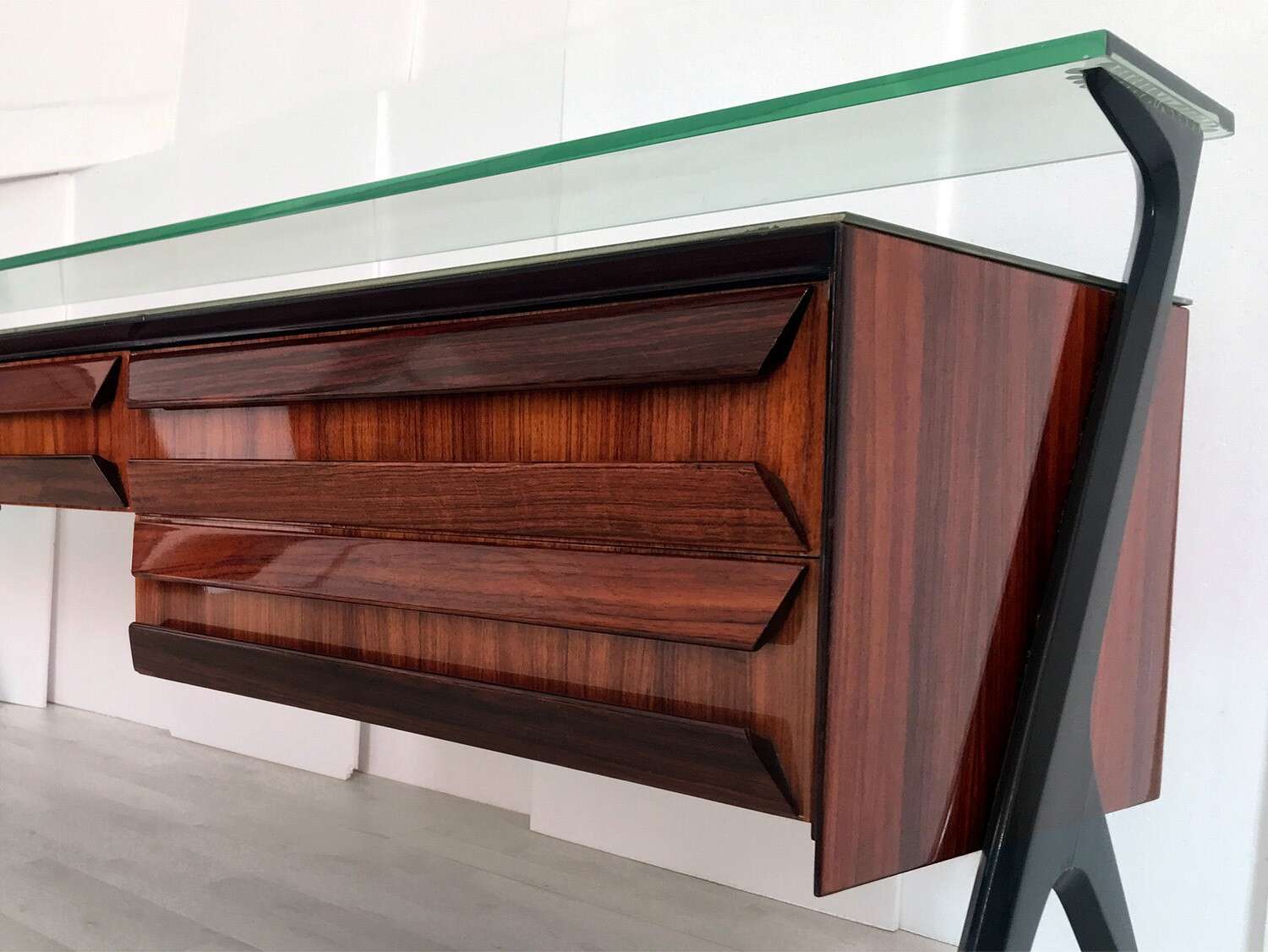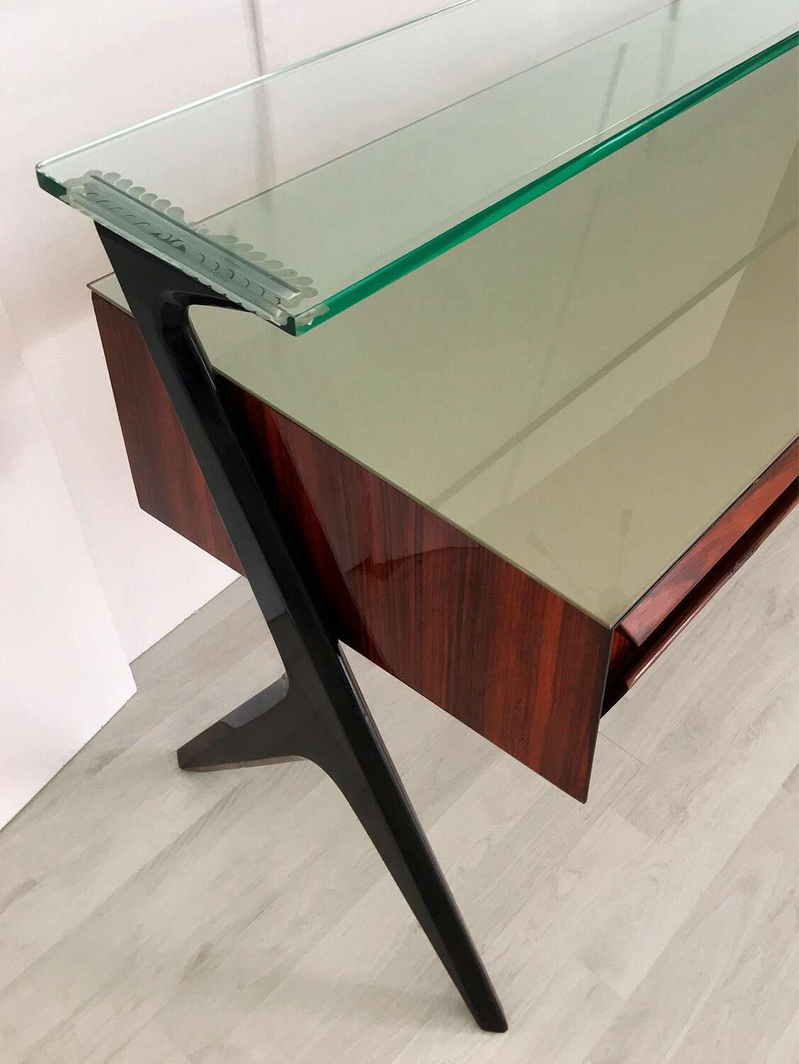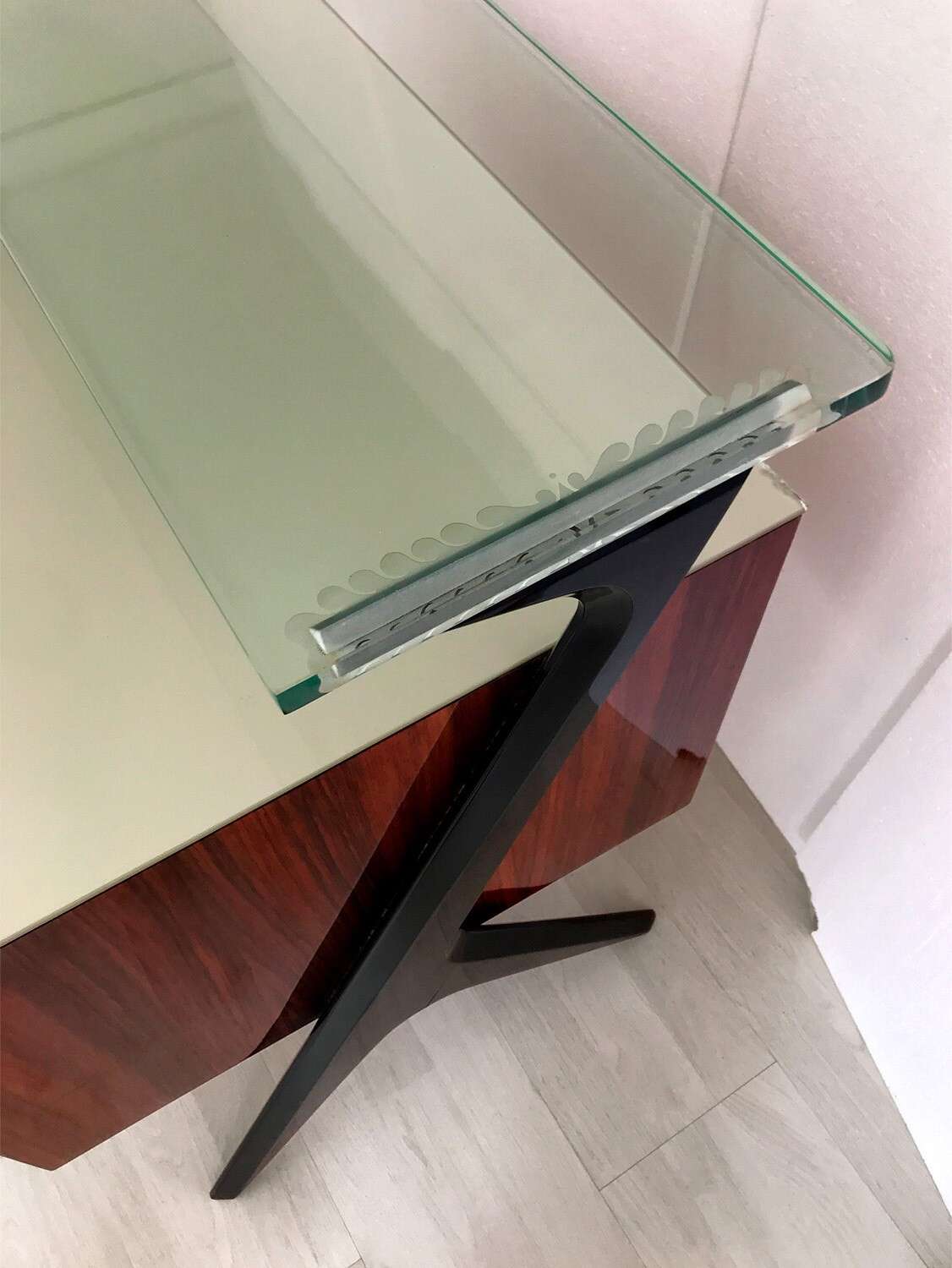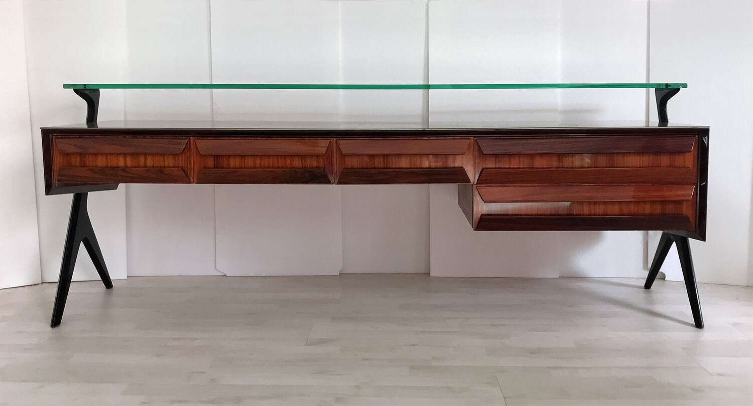 La sua unicità estetica è data dall'originale design scultoreo dei cassetti e dei supporti laterali, oltre che dal piano superiore in vetro verde sormontato da un lungo ripiano in cristallo trasparente molto spesso, finemente decorato sui lati e realizzato artigianalmente da Barovier & Toso a Murano.