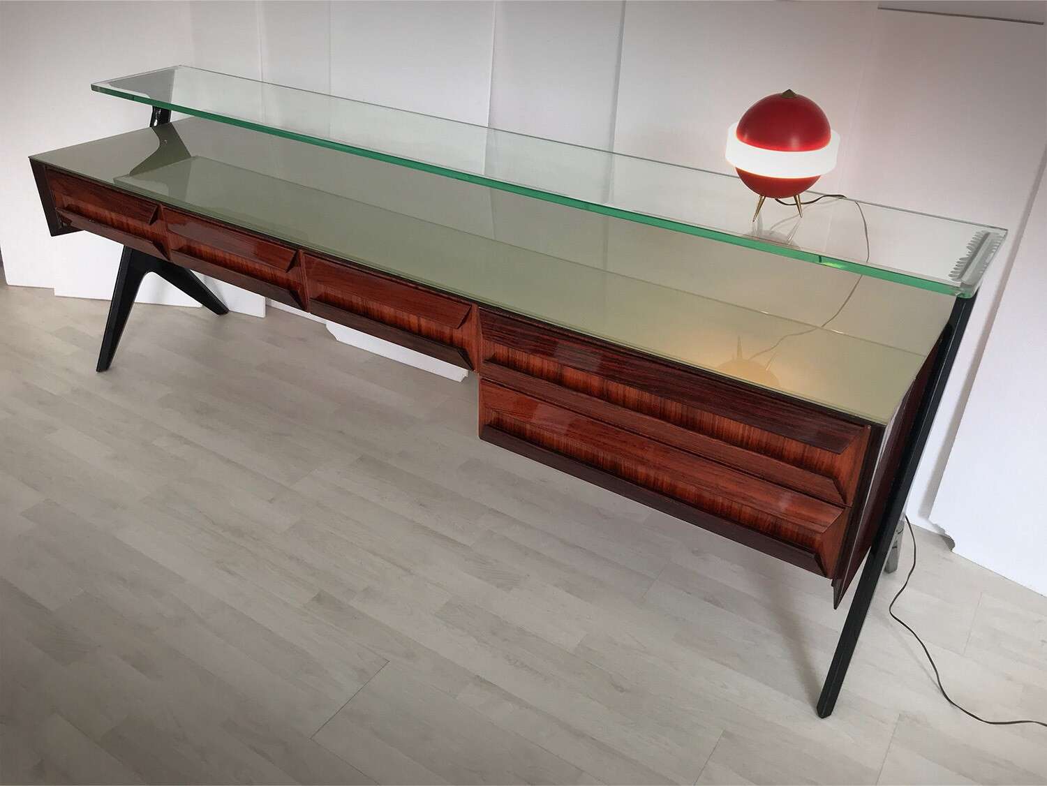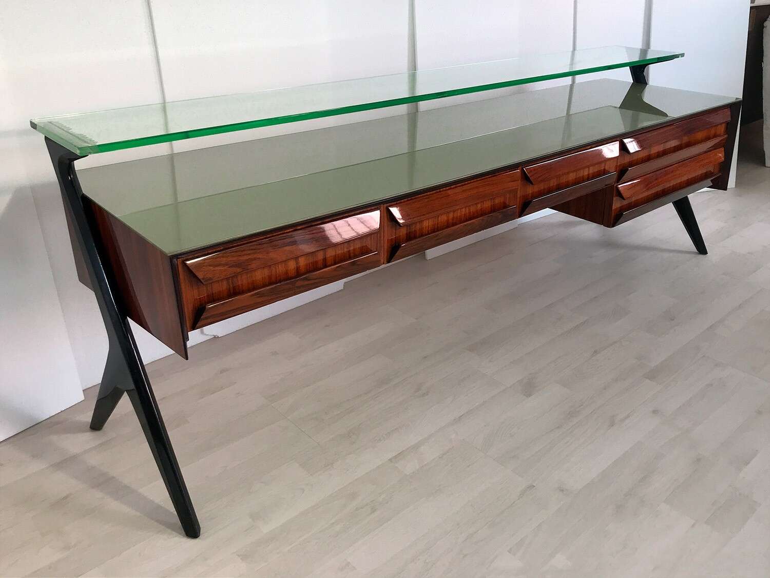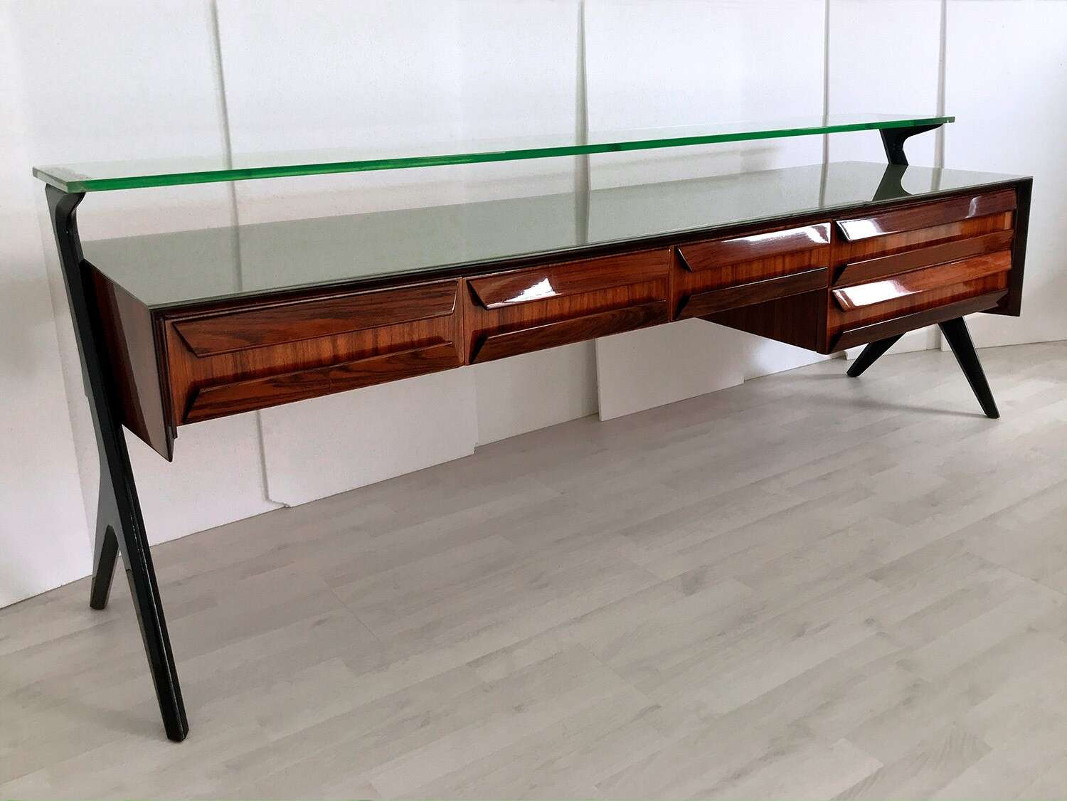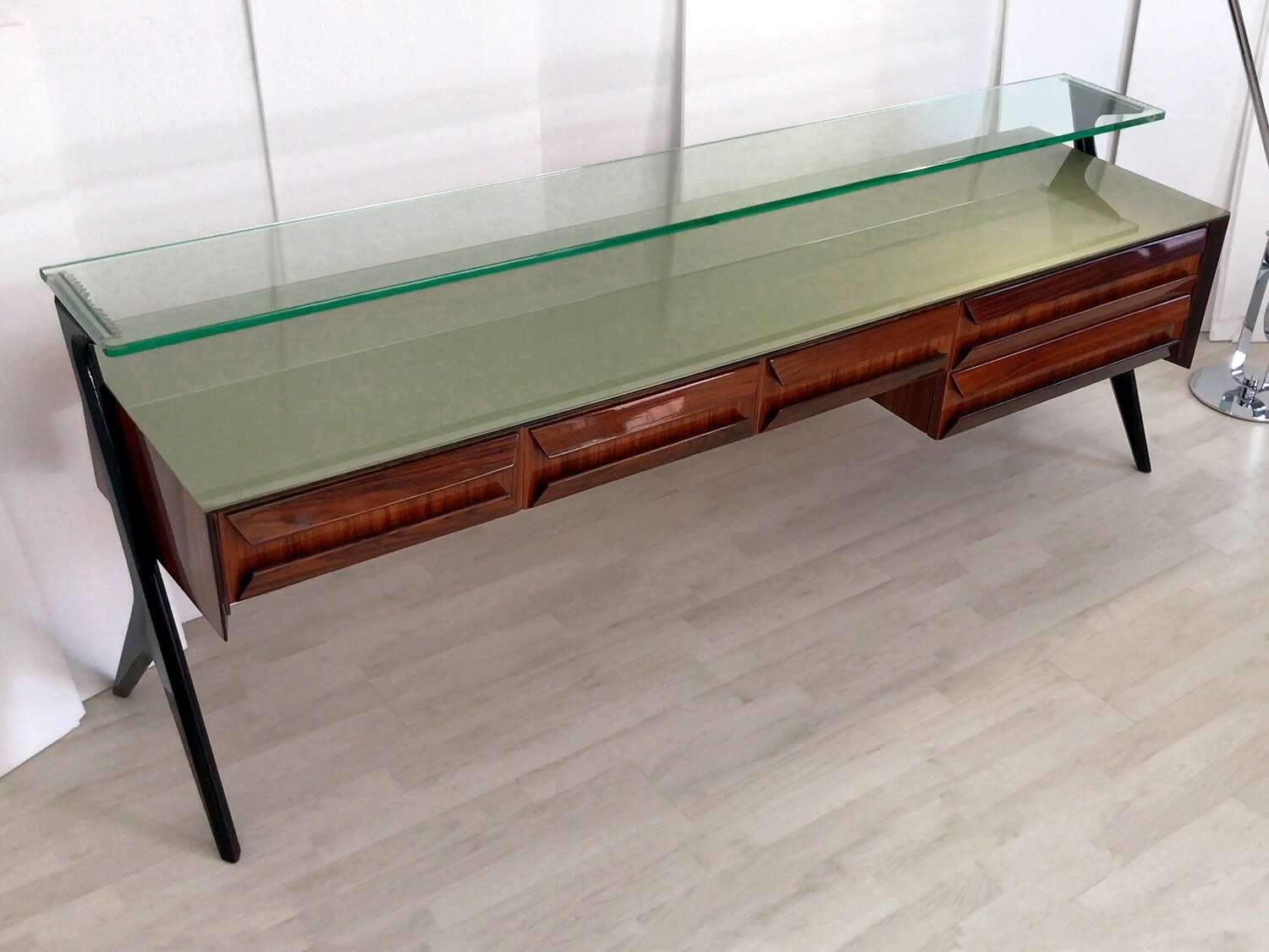La sua unicità estetica è data dall'originale design scultoreo dei cassetti e dei supporti laterali, oltre che dal piano superiore in vetro verde sormontato da un lungo ripiano in cristallo trasparente molto spesso, finemente decorato sui lati e realizzato artigianalmente da Barovier & Toso a Murano.