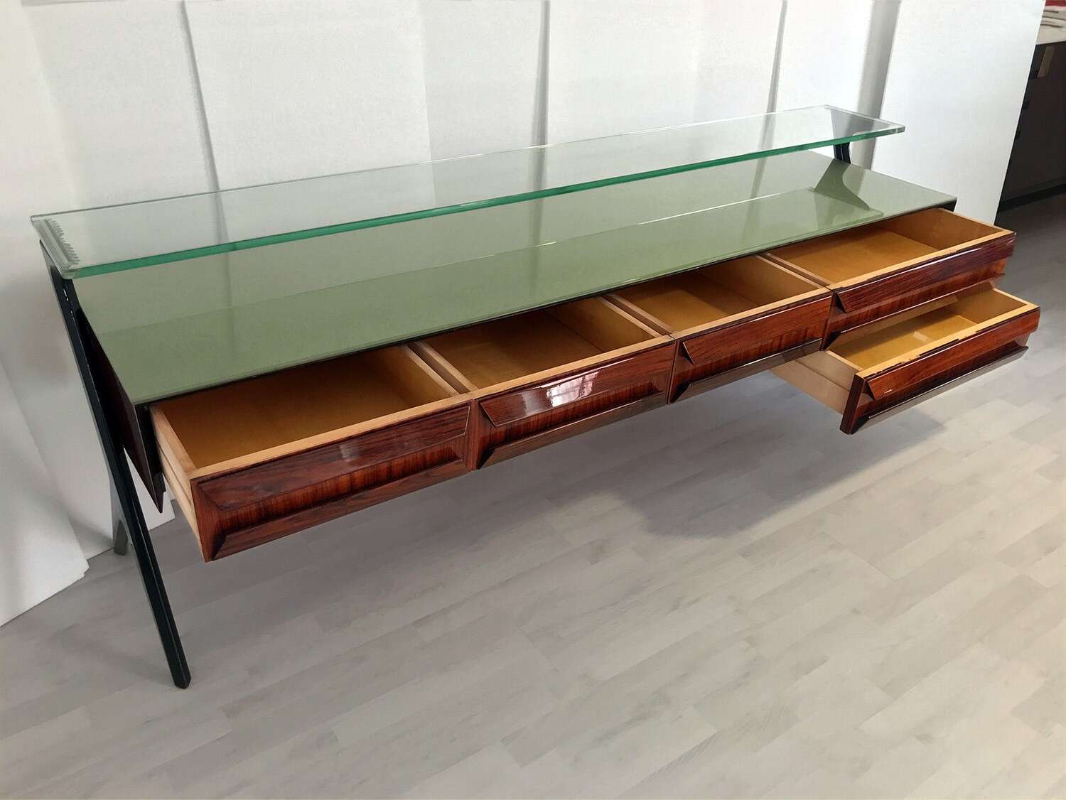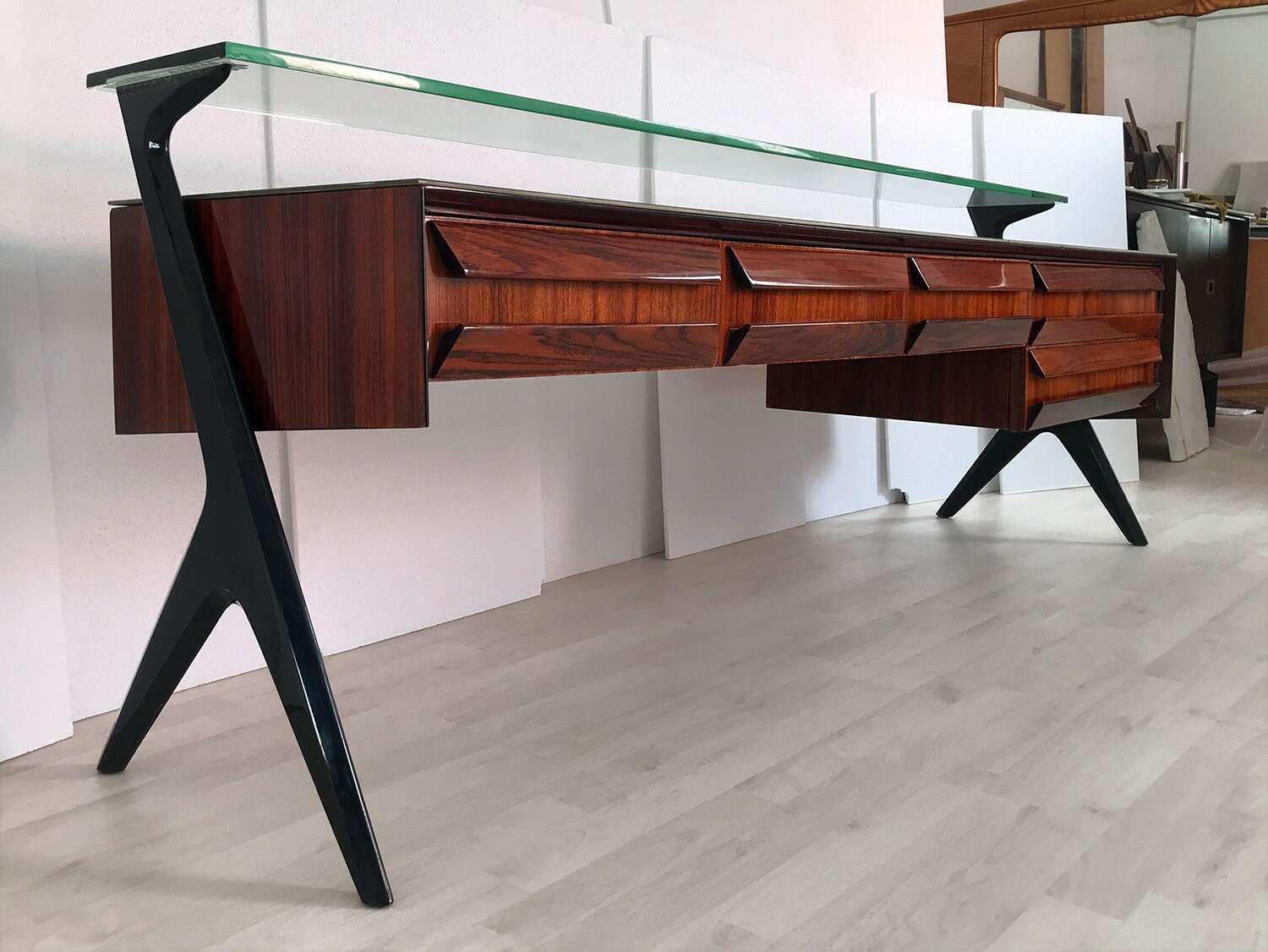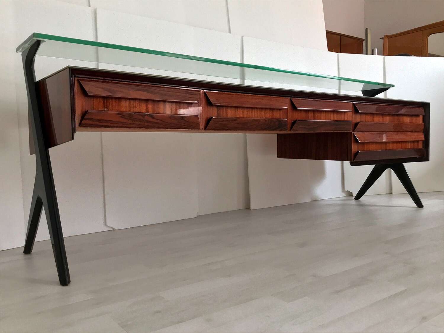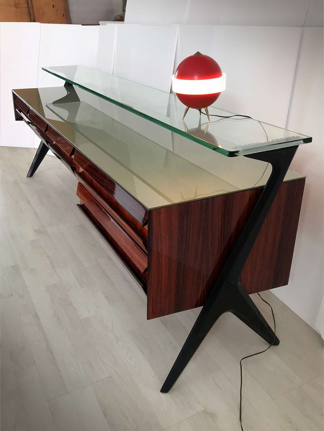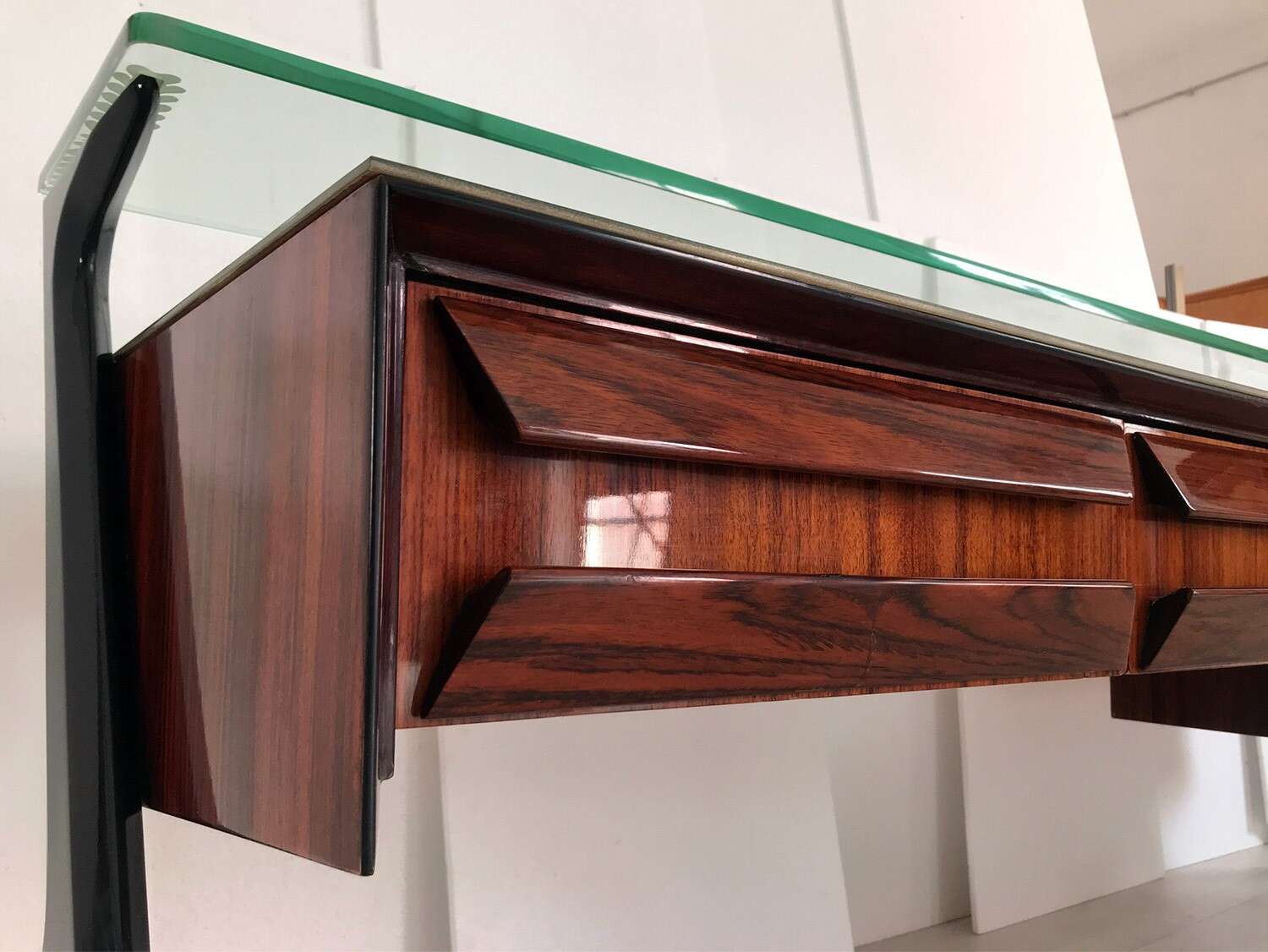 La sua unicità estetica è data dall'originale design scultoreo dei cassetti e dei supporti laterali, oltre che dal piano superiore in vetro verde sormontato da un lungo ripiano in cristallo trasparente molto spesso, finemente decorato sui lati e realizzato artigianalmente da Barovier & Toso a Murano.