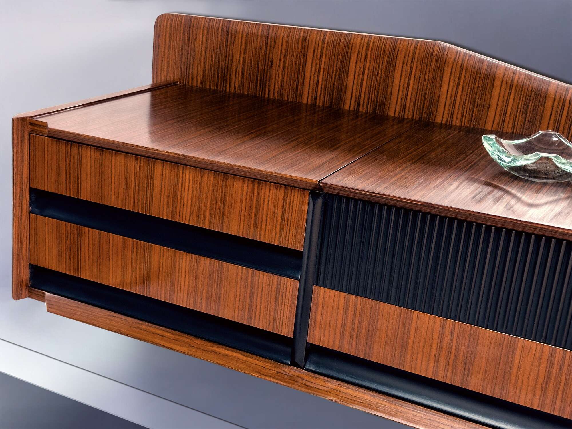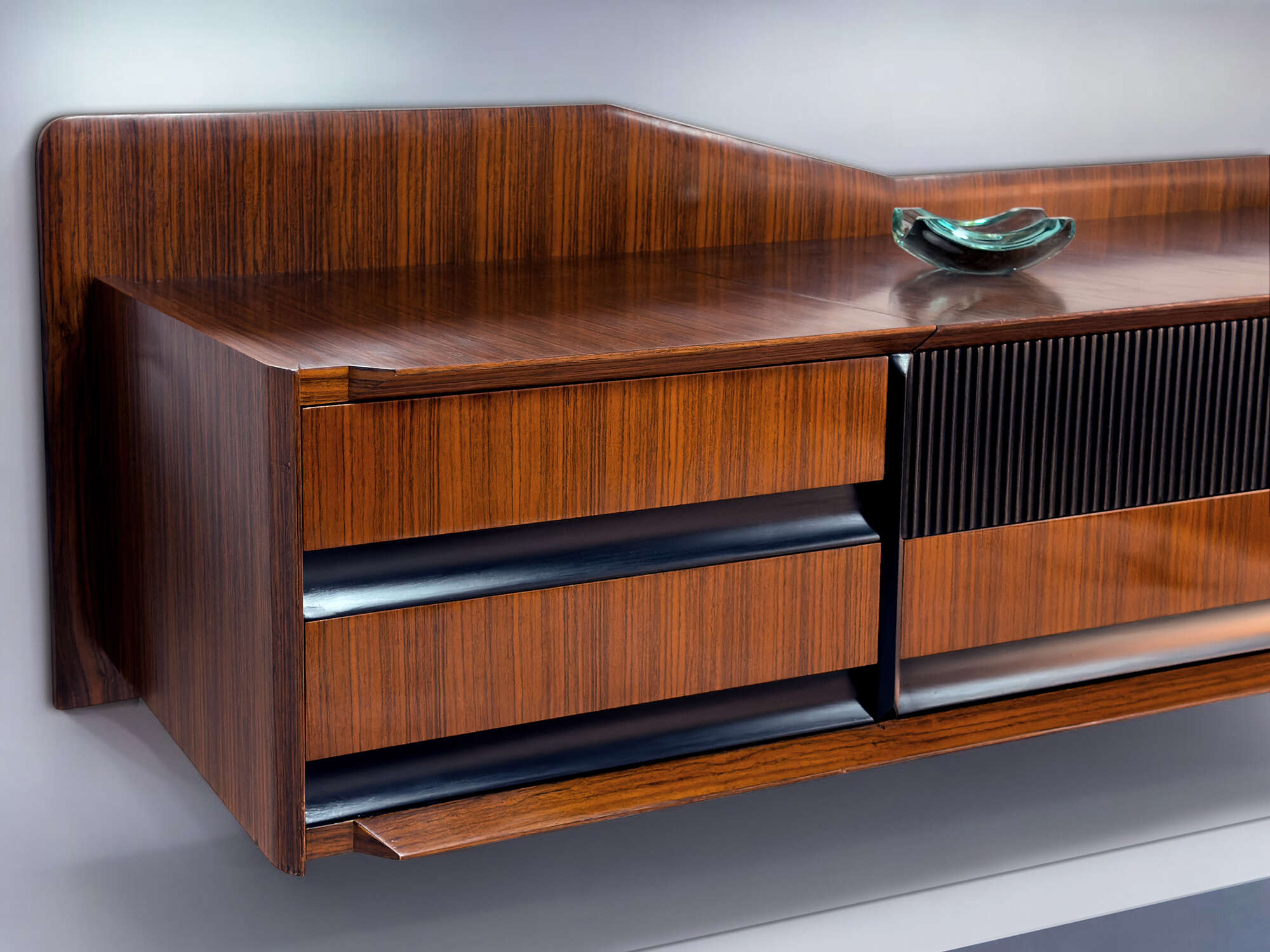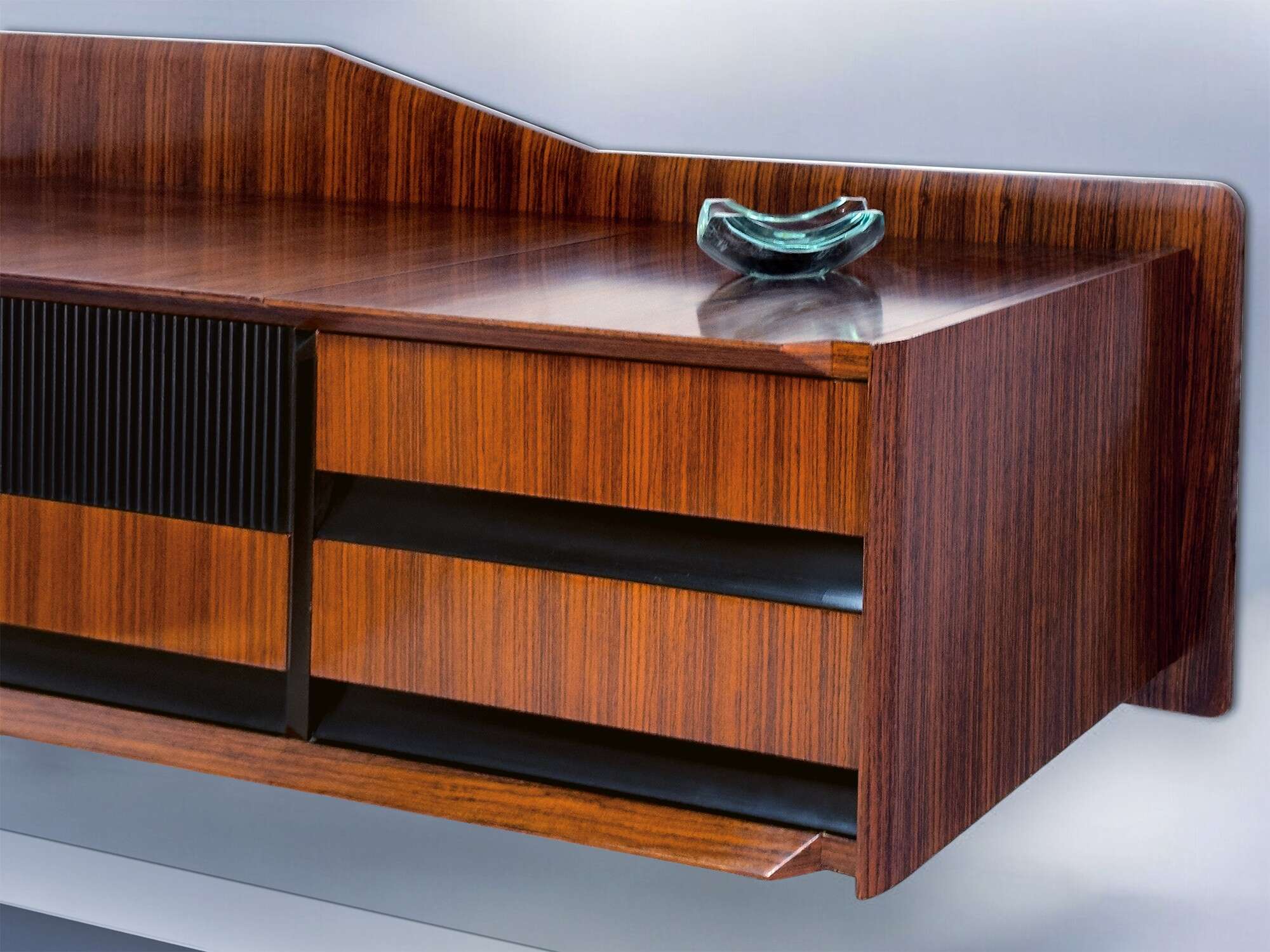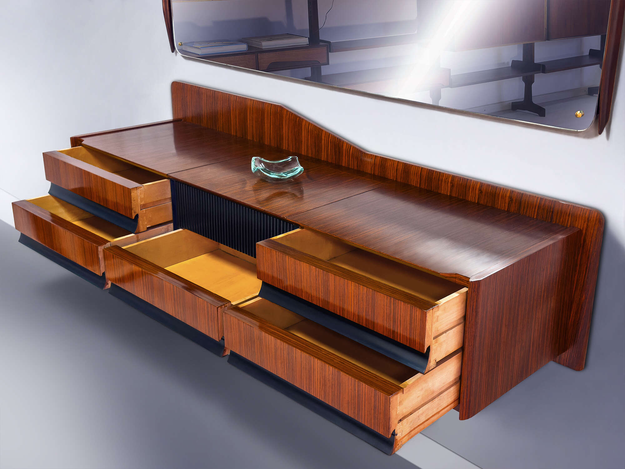Tutti gli articoli progettati e realizzati da Vittorio Dassi sono sempre eleganti e affascinanti, e l'unicità di questi pezzi è data dal design scultoreo della credenza e dalla presenza di uno specchio con bordi in legno di grande eleganza.