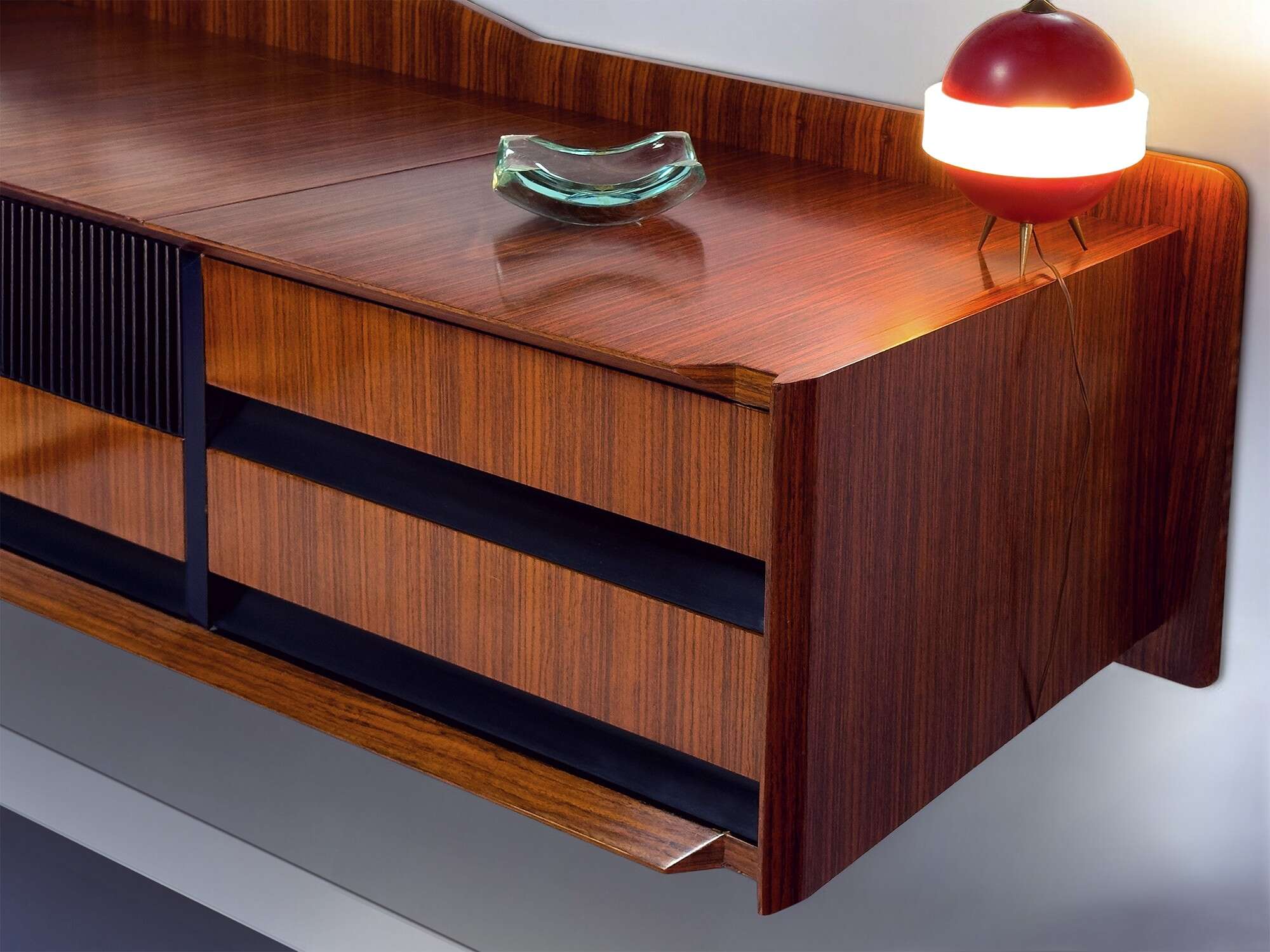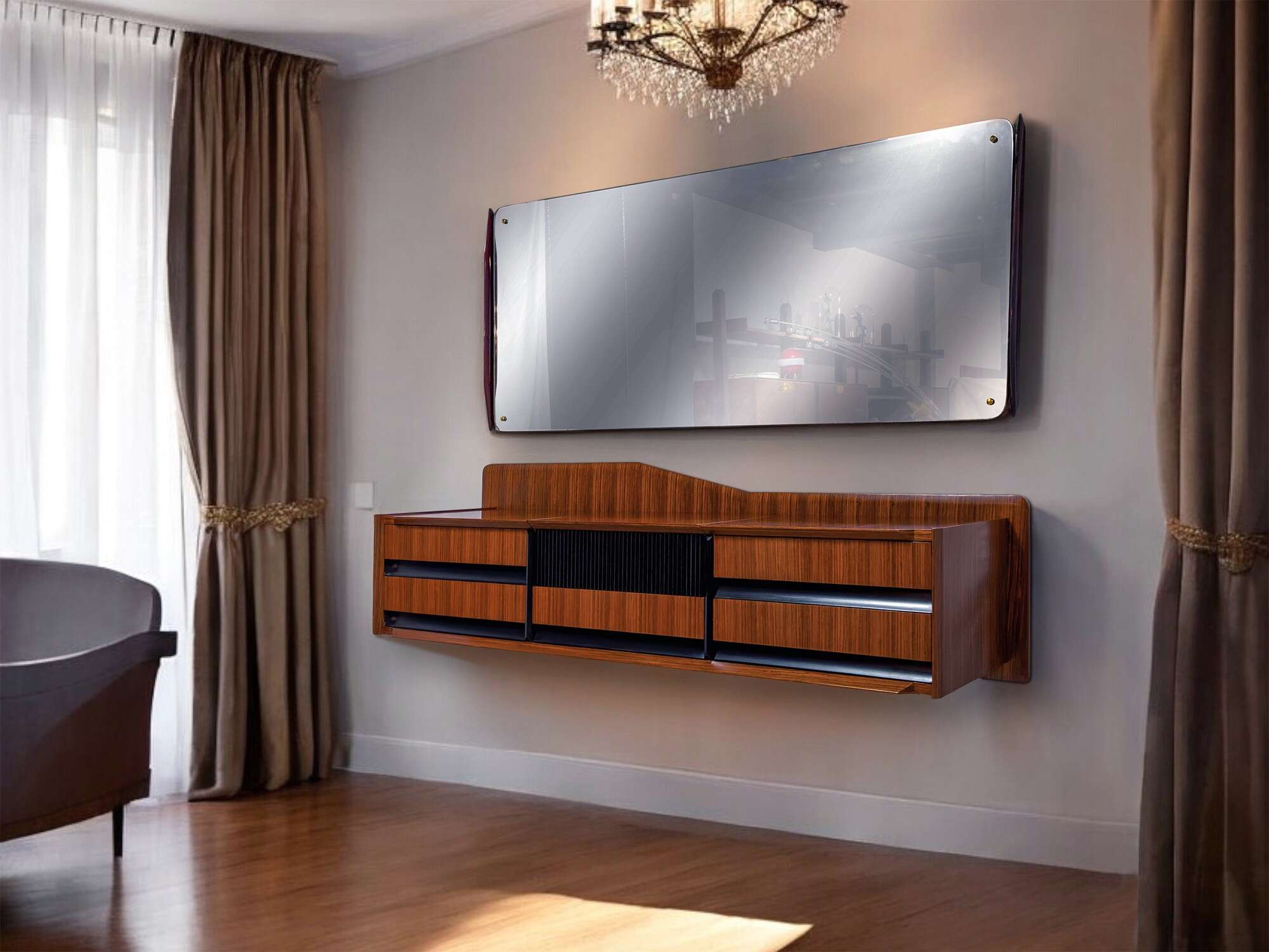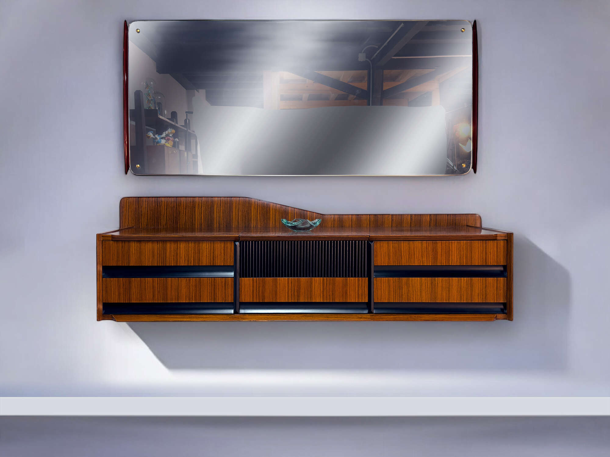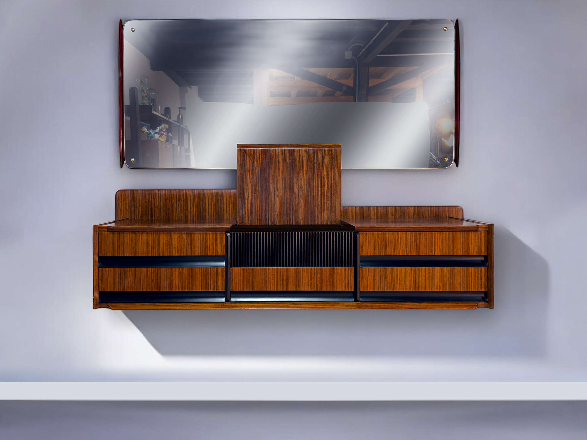 Splendida e rara credenza e/o cassettiera italiana in sospensione a muro con specchio, splendidamente progettata da Vittorio Dassi negli anni '50, realizzata con un materiale pregiato come il caldo legno di teak.