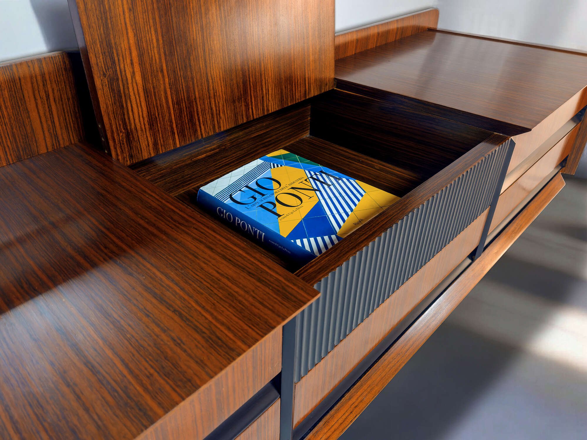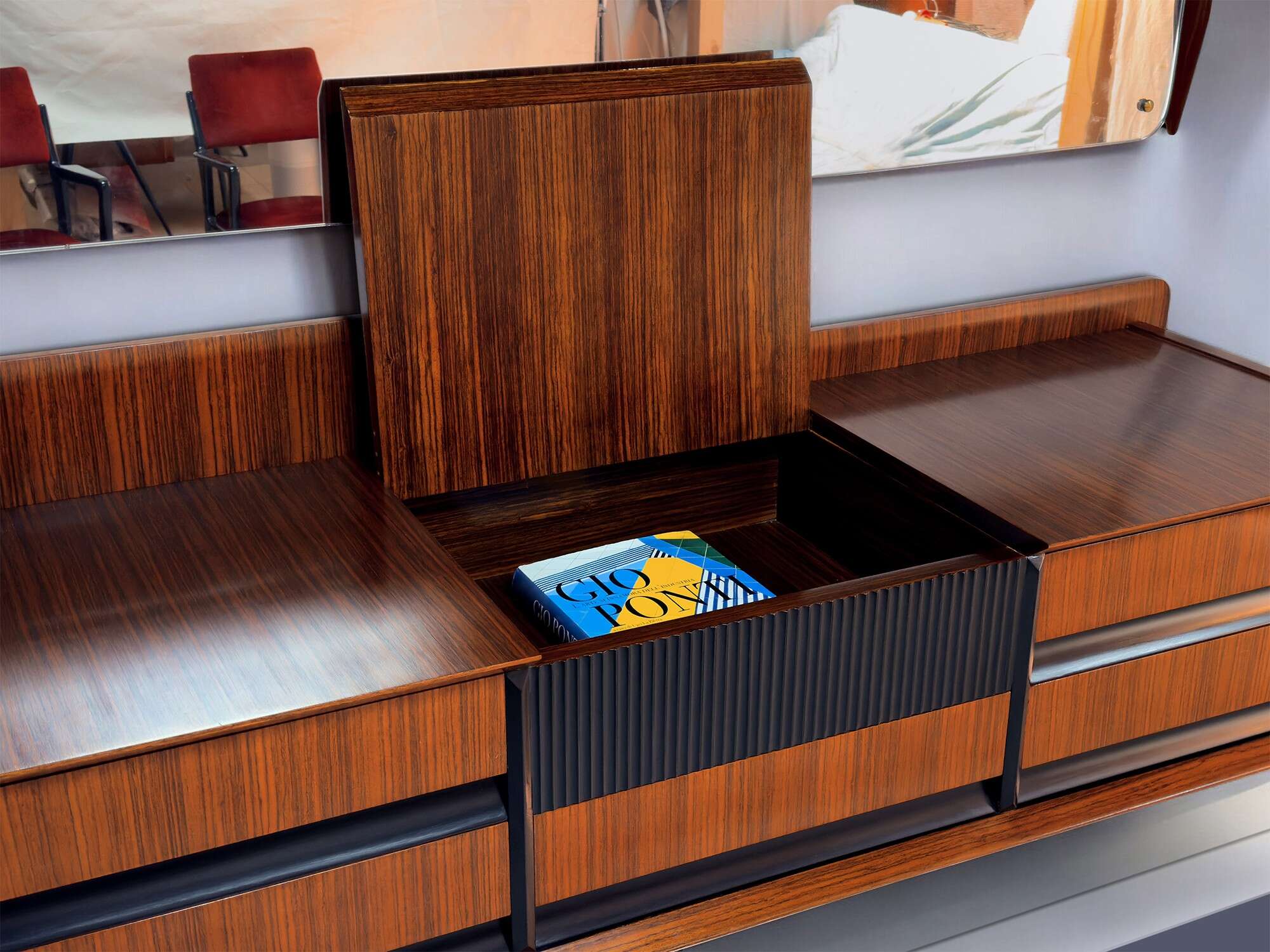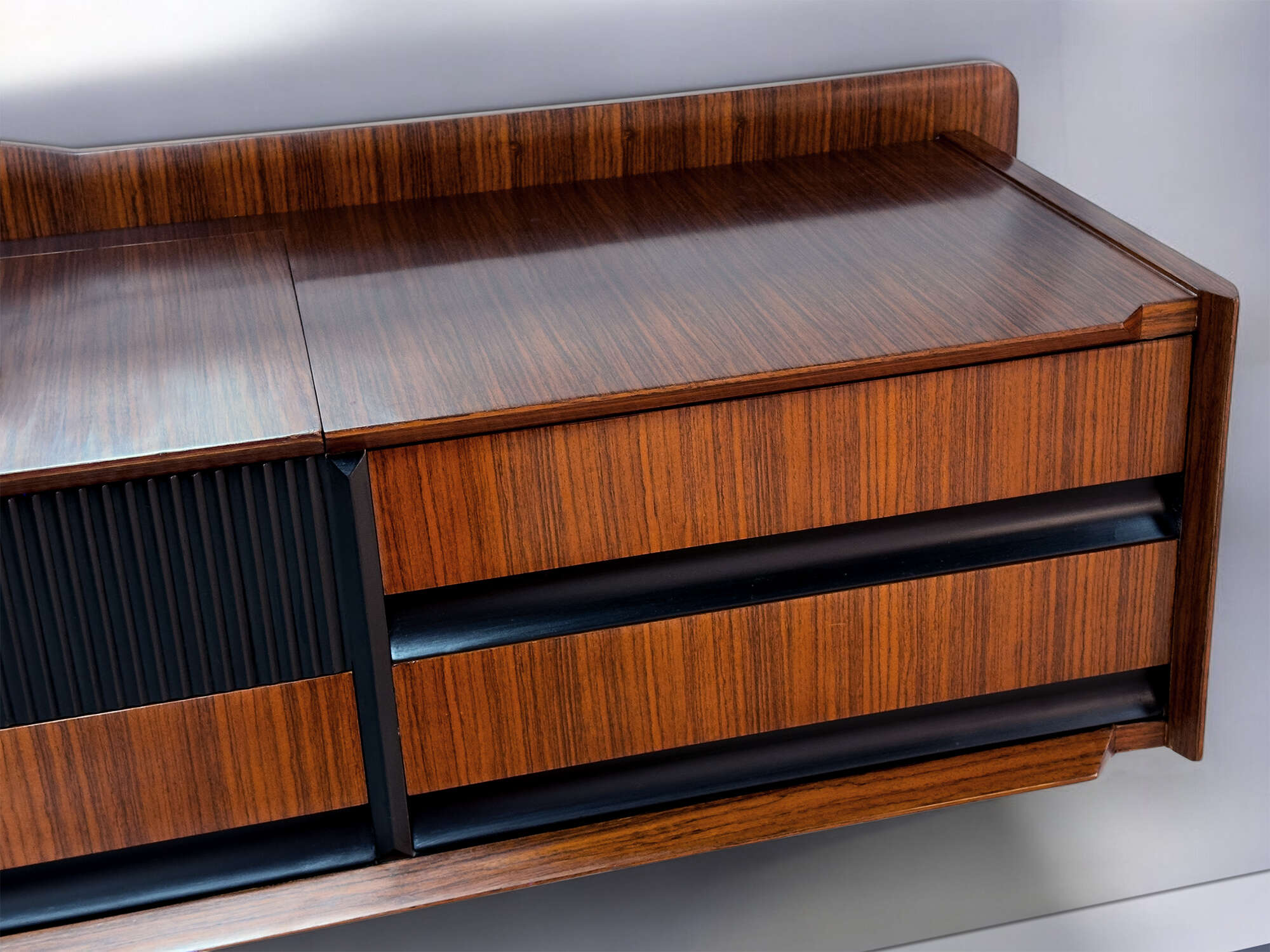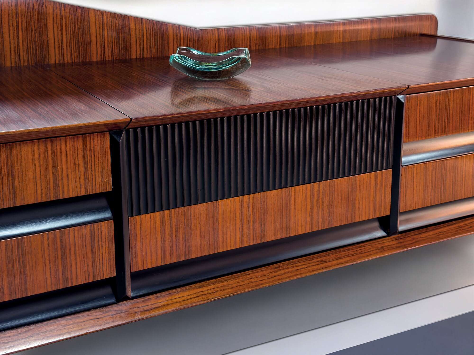 La credenza presenta nella parte superiore un'anta a ribalta, con un'ottima finitura frontale data dalla grissinatura ebanizzata.