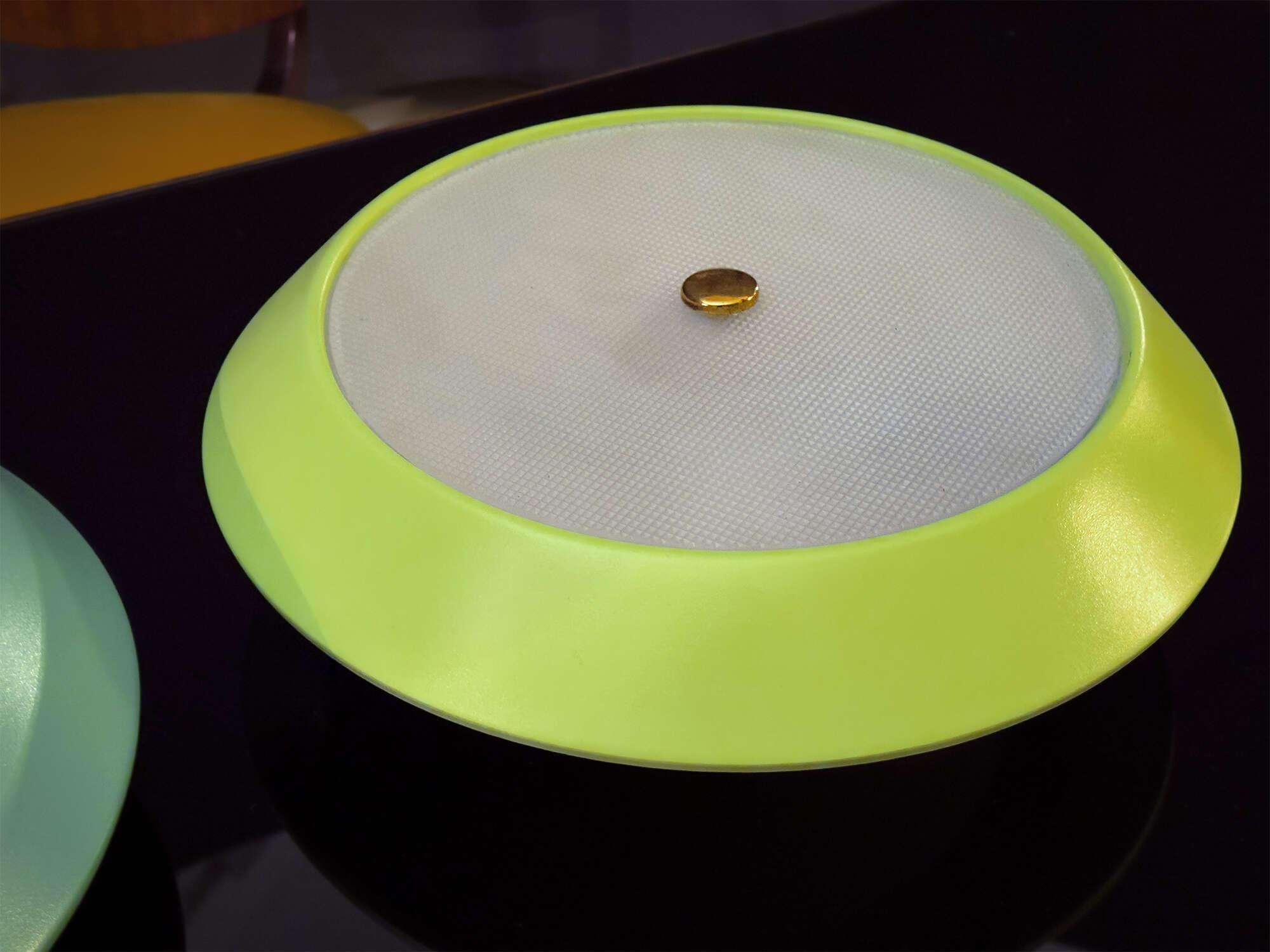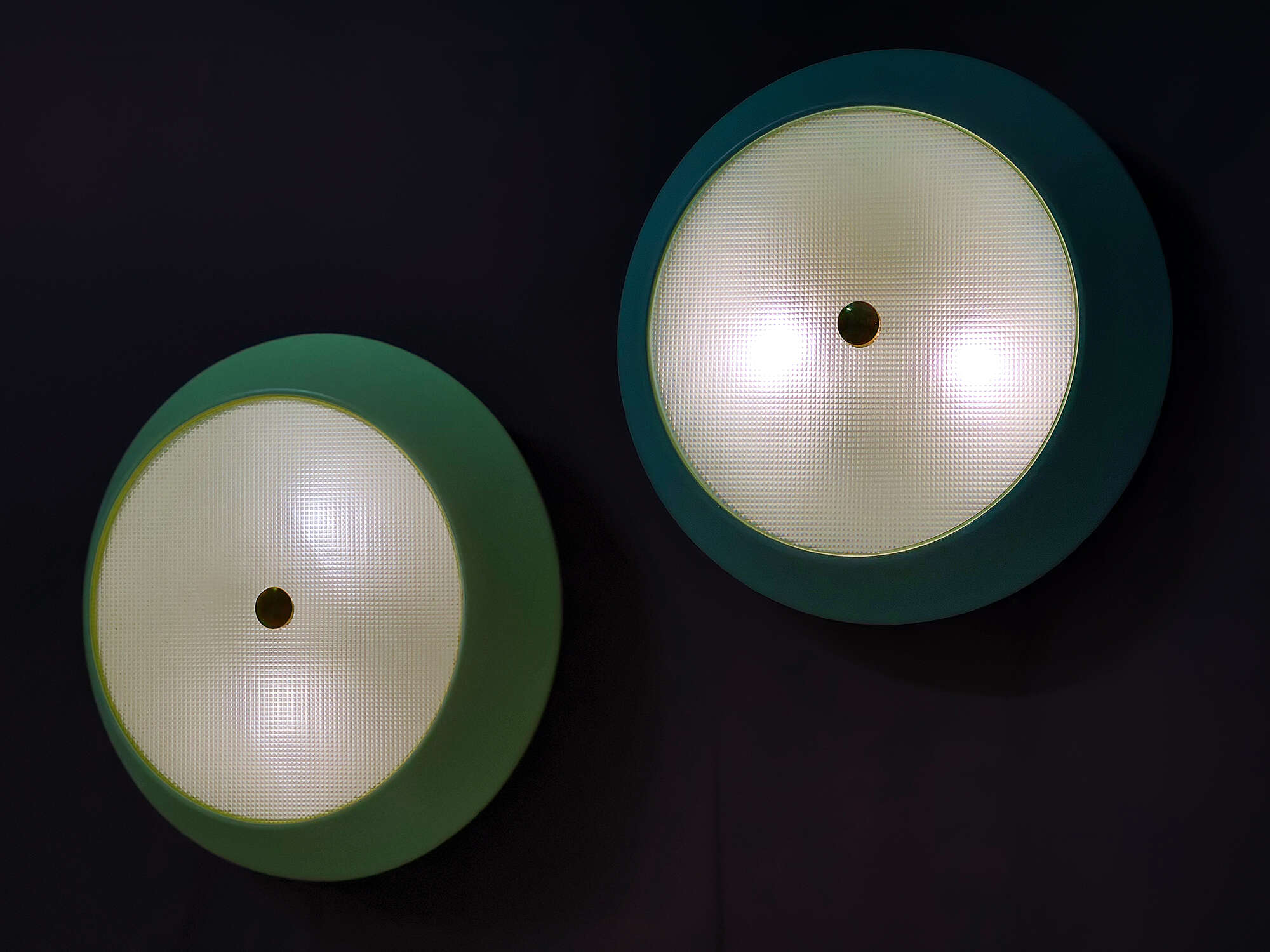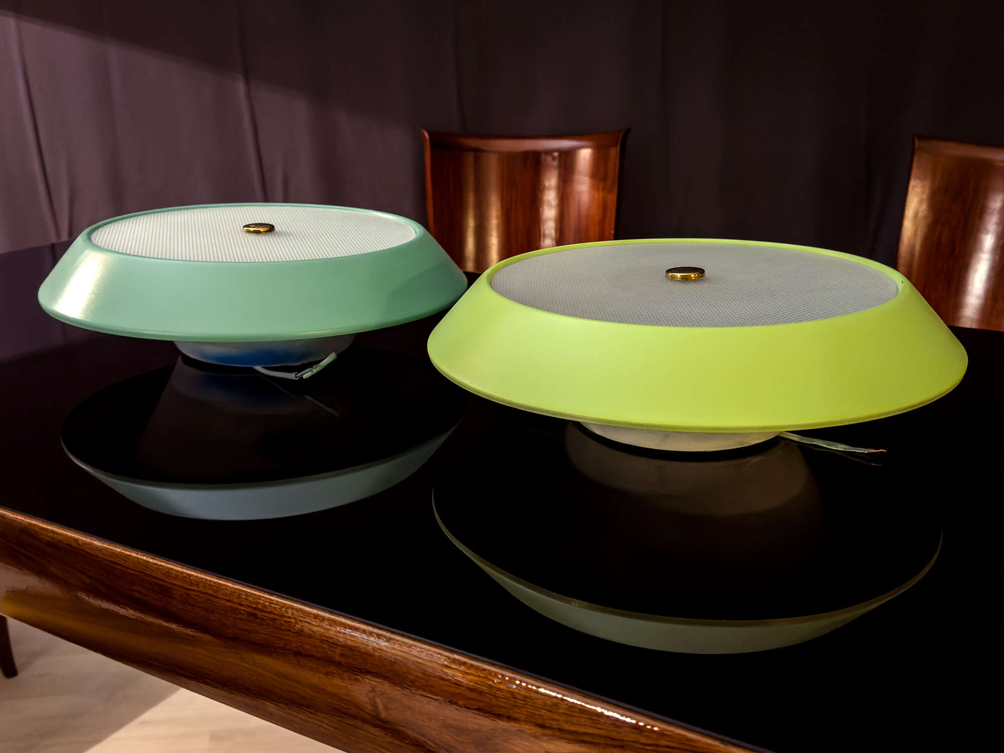 Sono in ottime condizioni, entrambi i diffusori rotondi sono in alluminio e sono stati riverniciati nei loro colori originali, rispettivamente giallo canarino e verde salvia.