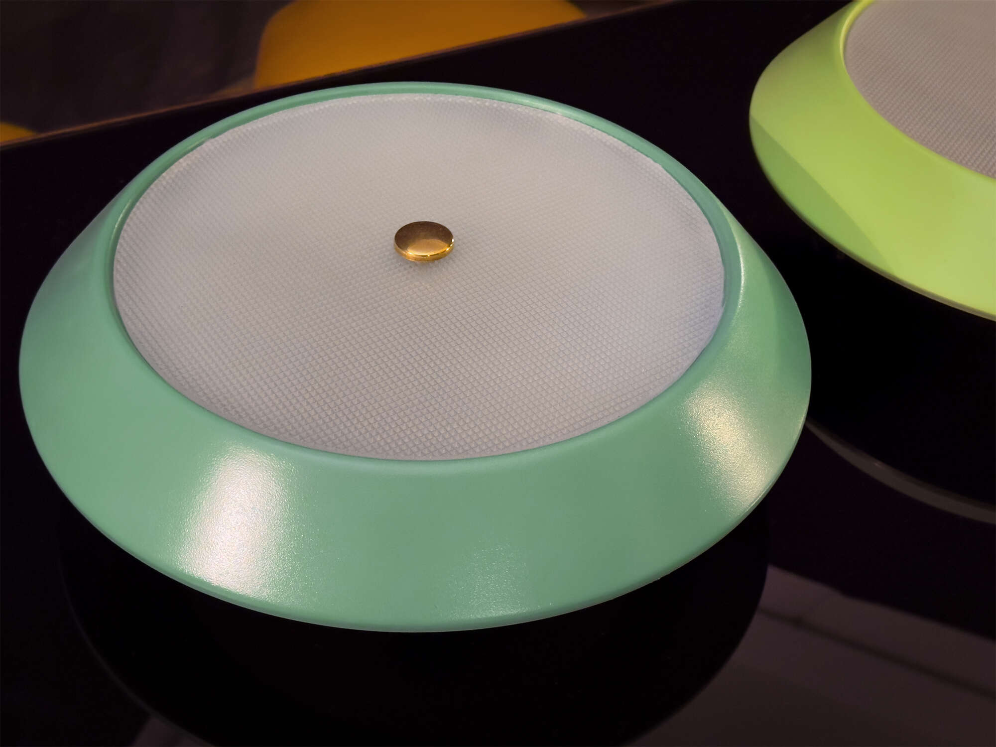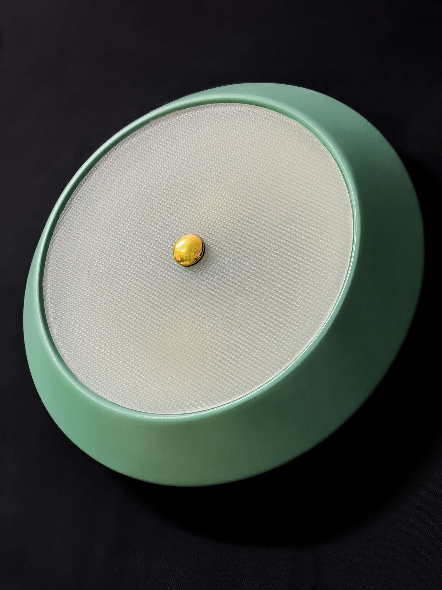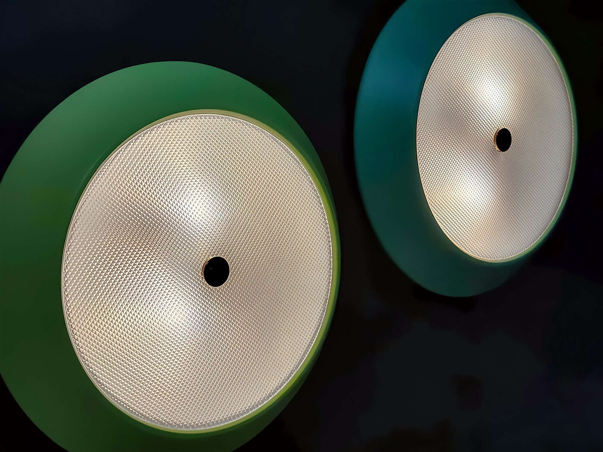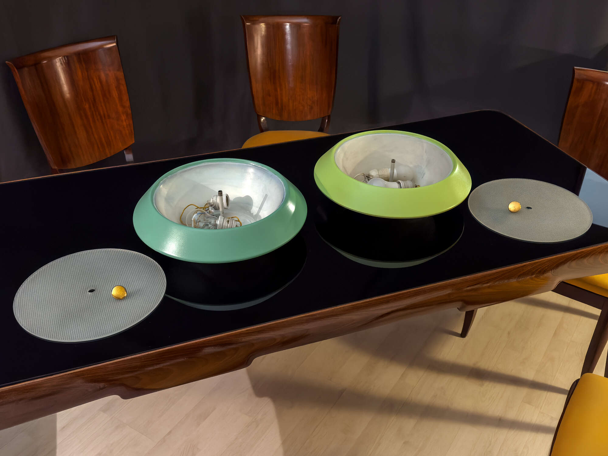 Sono in ottime condizioni, entrambi i diffusori rotondi sono in alluminio e sono stati riverniciati nei loro colori originali, rispettivamente giallo canarino e verde salvia.