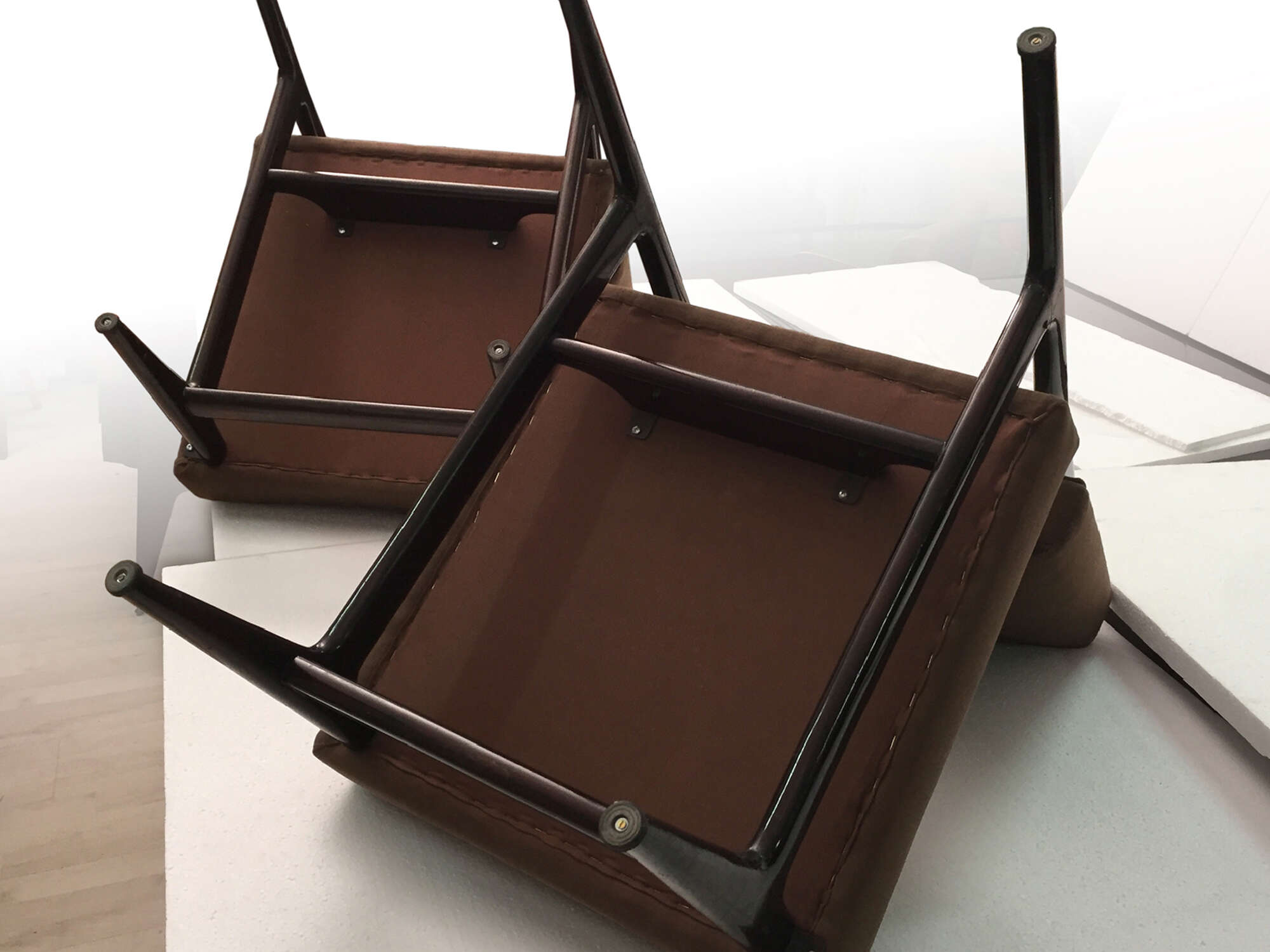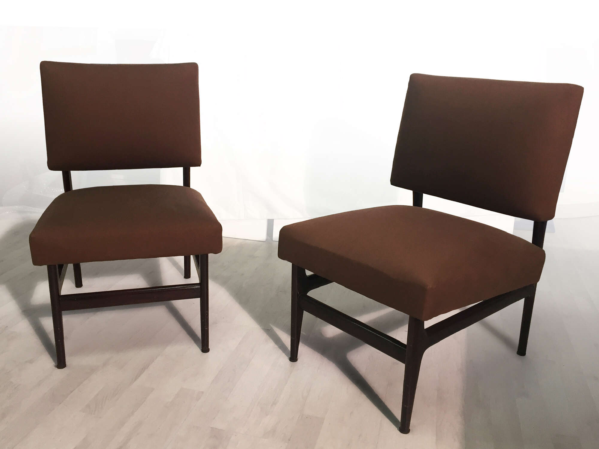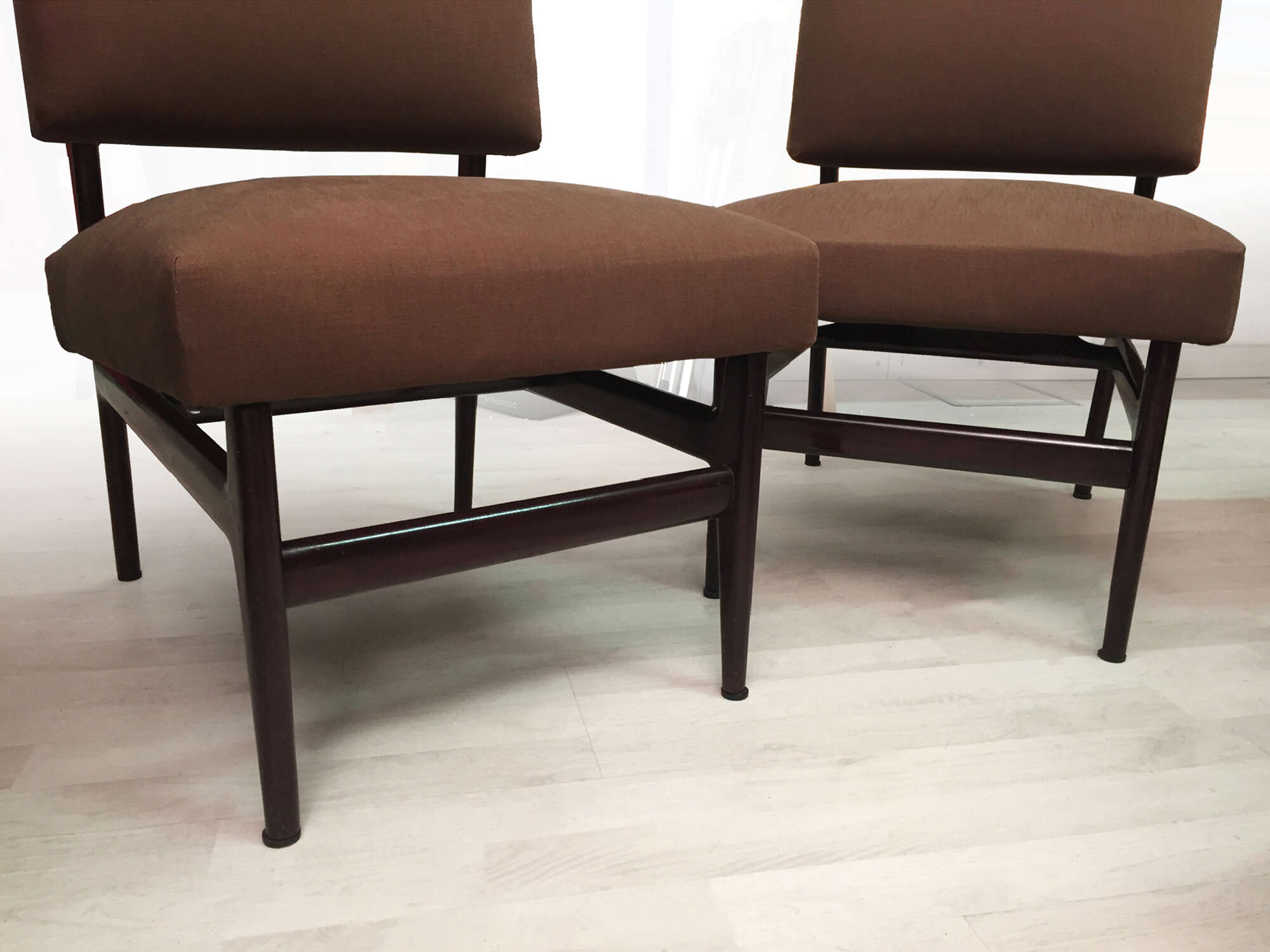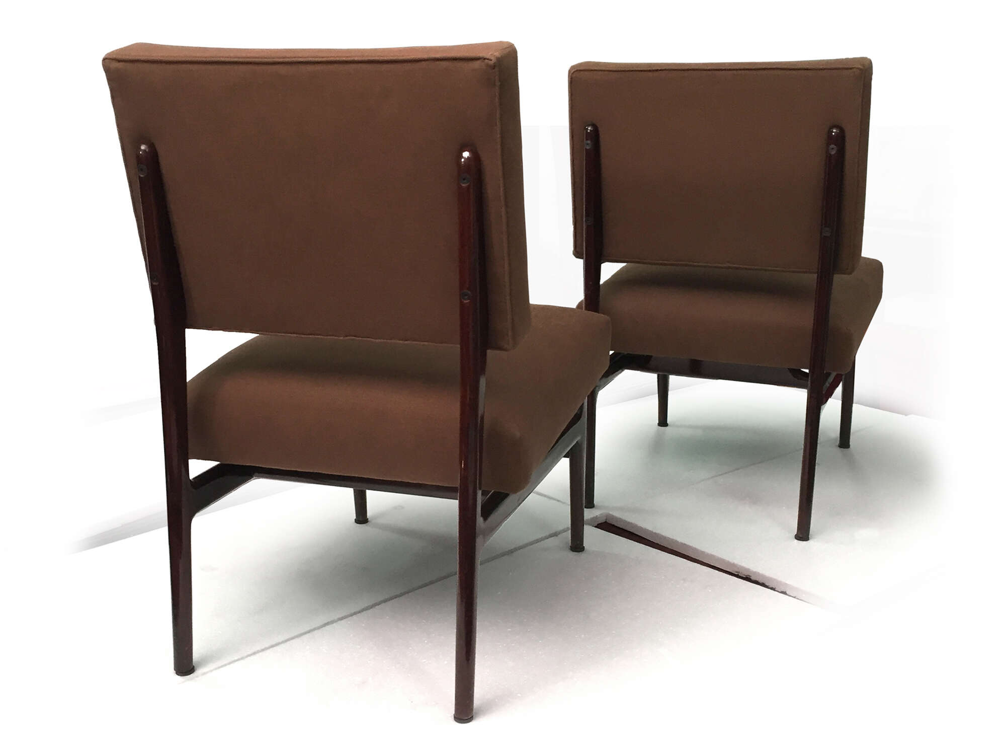 Le strutture in legno sono in mogano con sedute rivestite in tessuto di cotone marrone, entrambe in ottime condizioni d'epoca, senza danni strutturali e/o strappi al tessuto. Anche le molle e l'imbottitura sono in ottime condizioni.