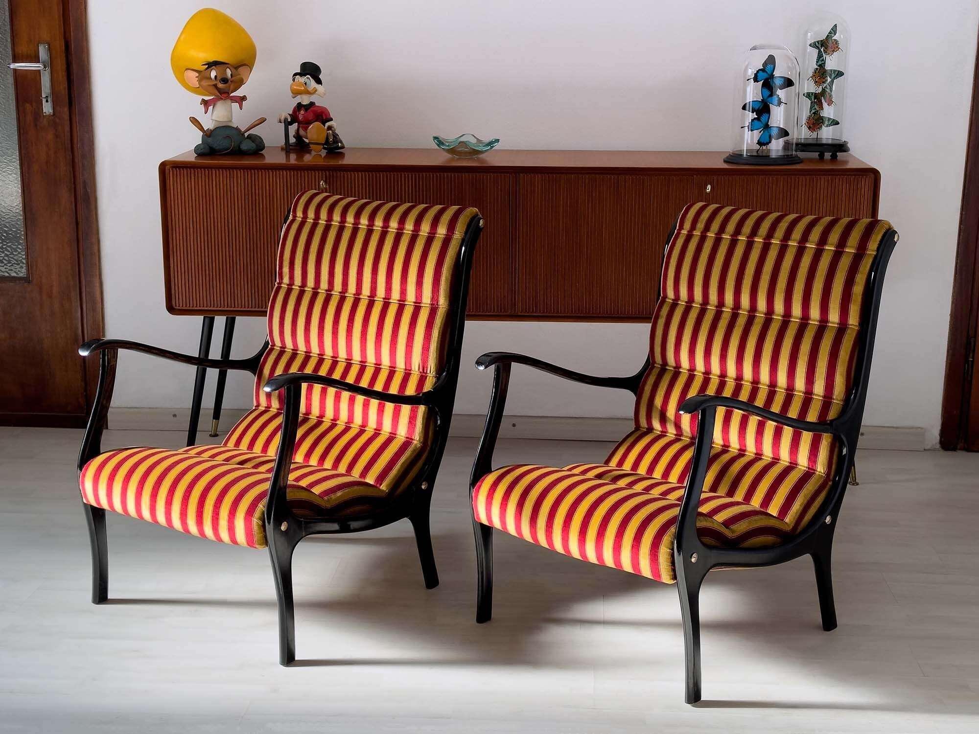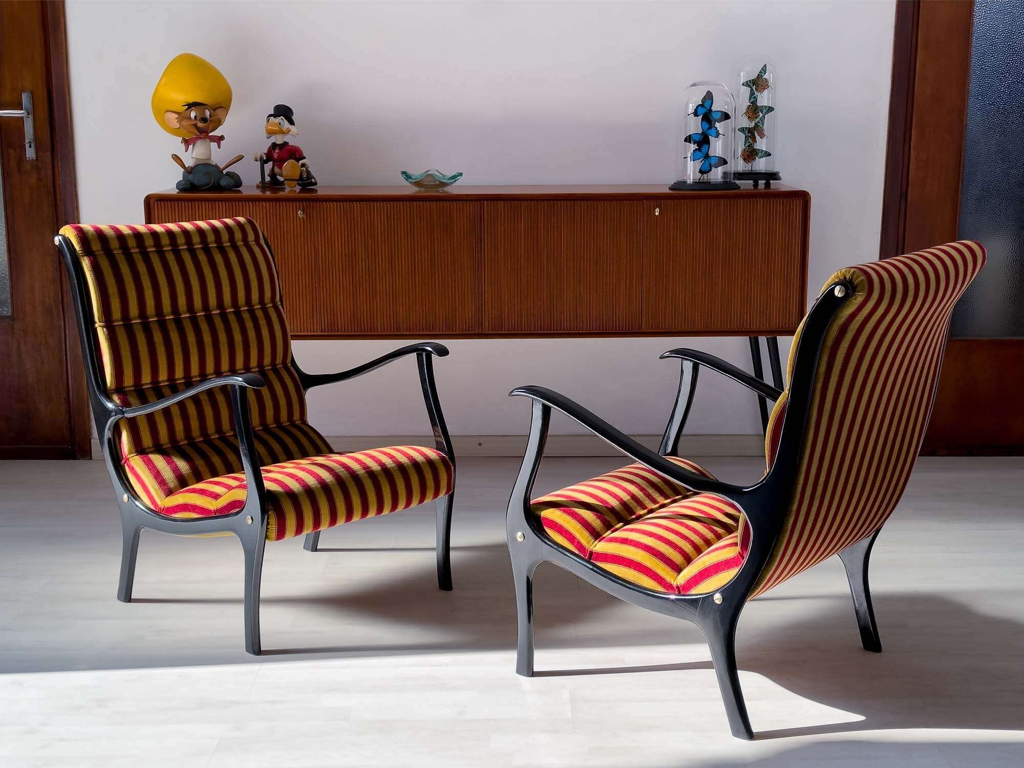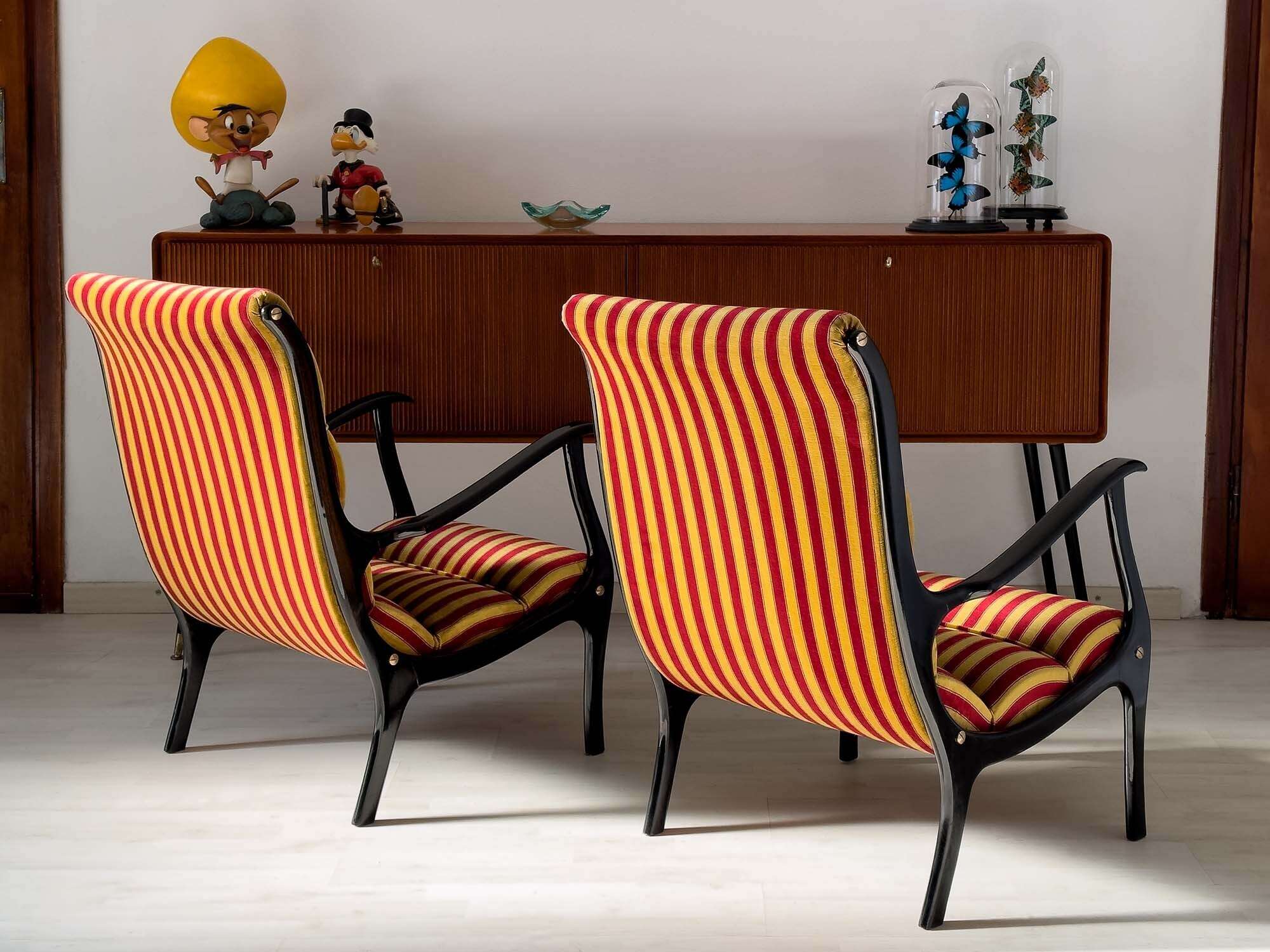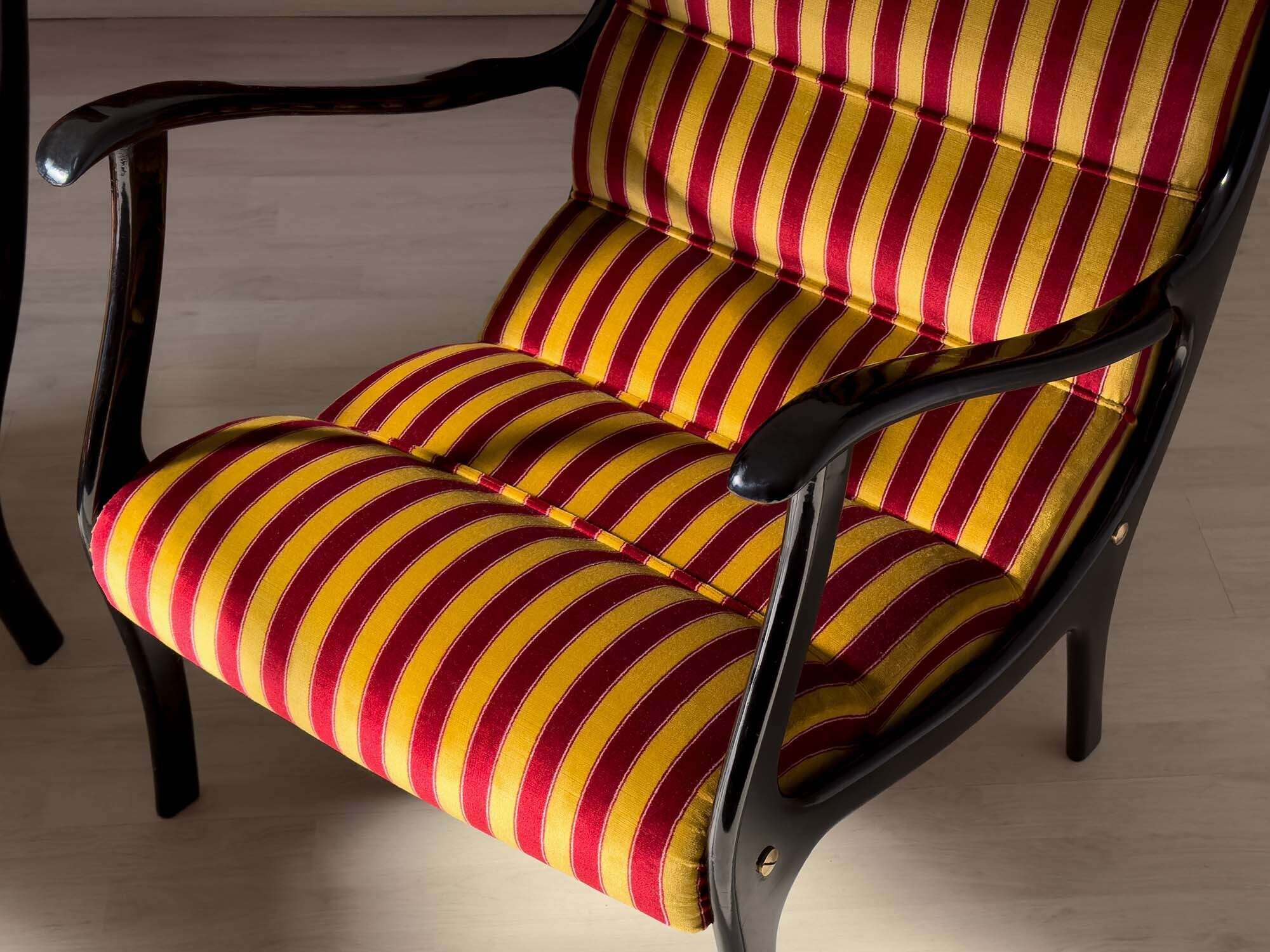 Struttura in legno ebanizzato e laccato, rivestimento in velluto a righe (nuovo).