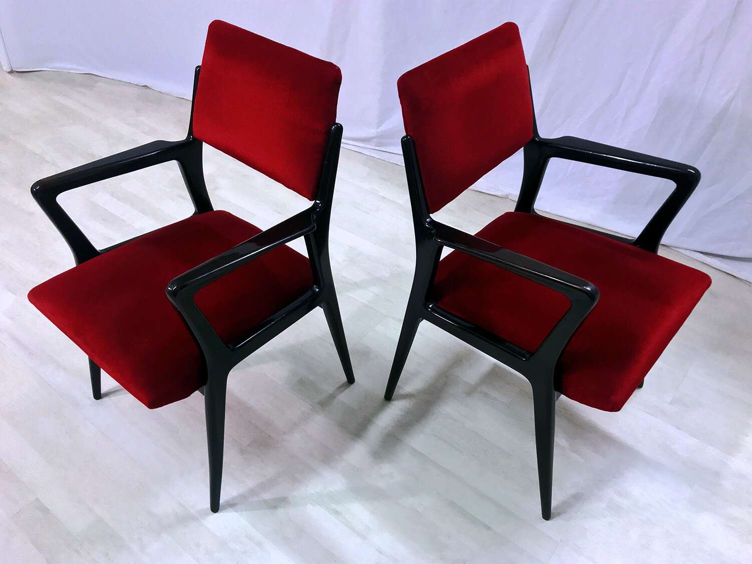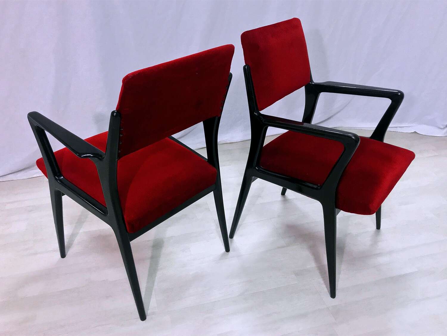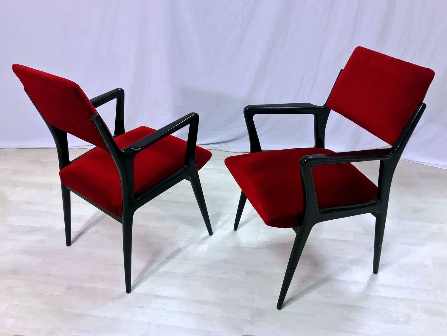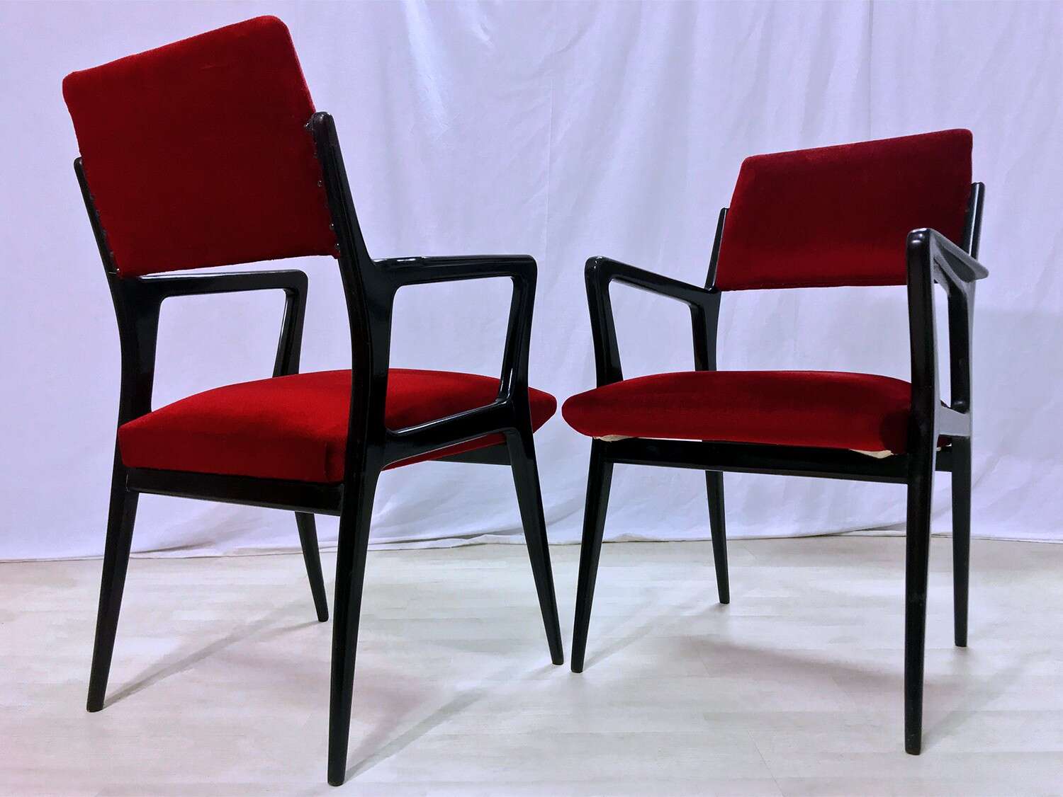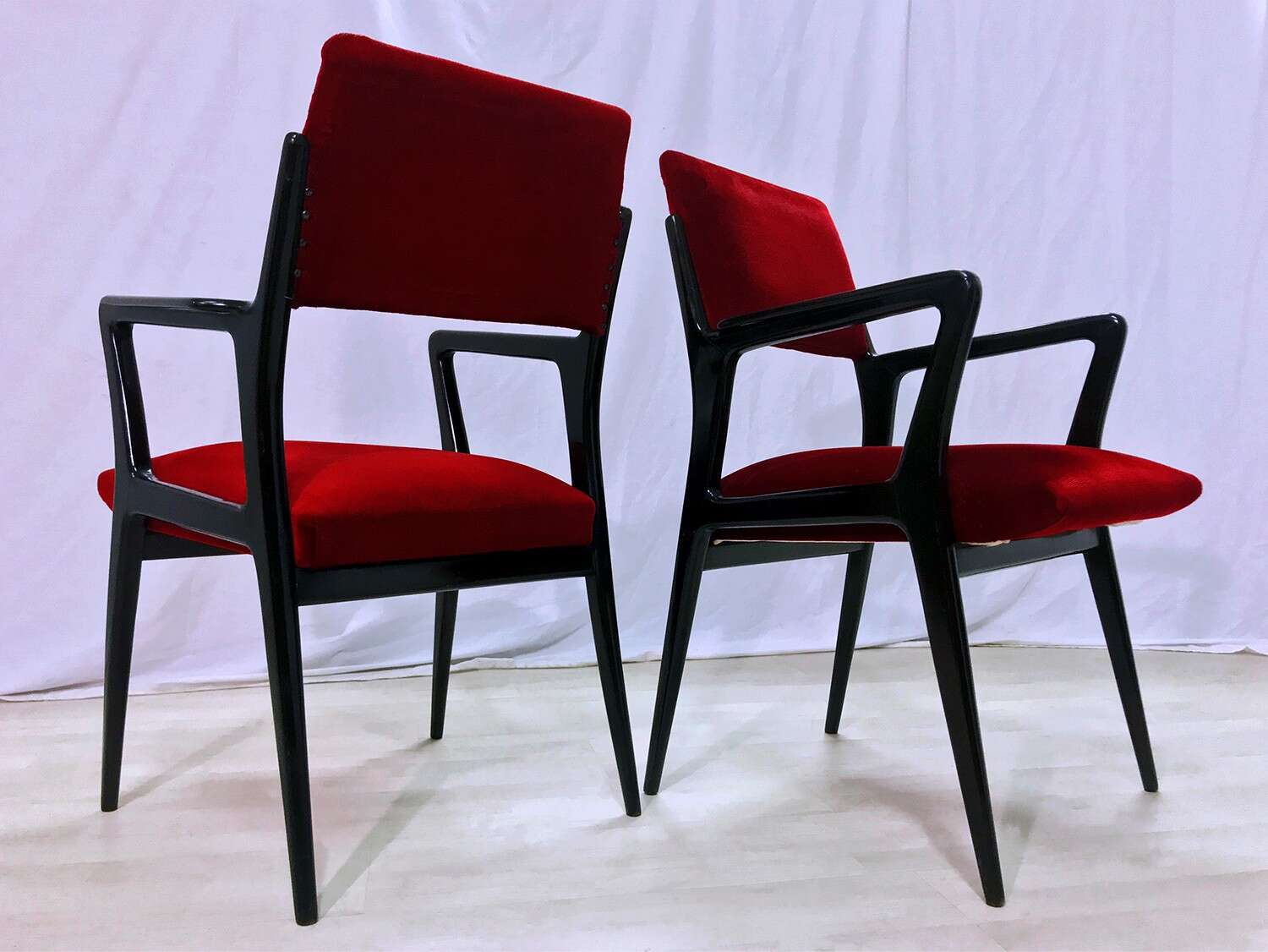 Coppia di sedie con braccioli italiane in velluto rosso, anni '50