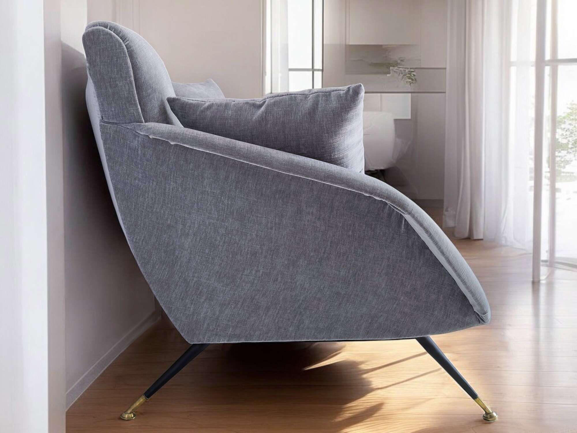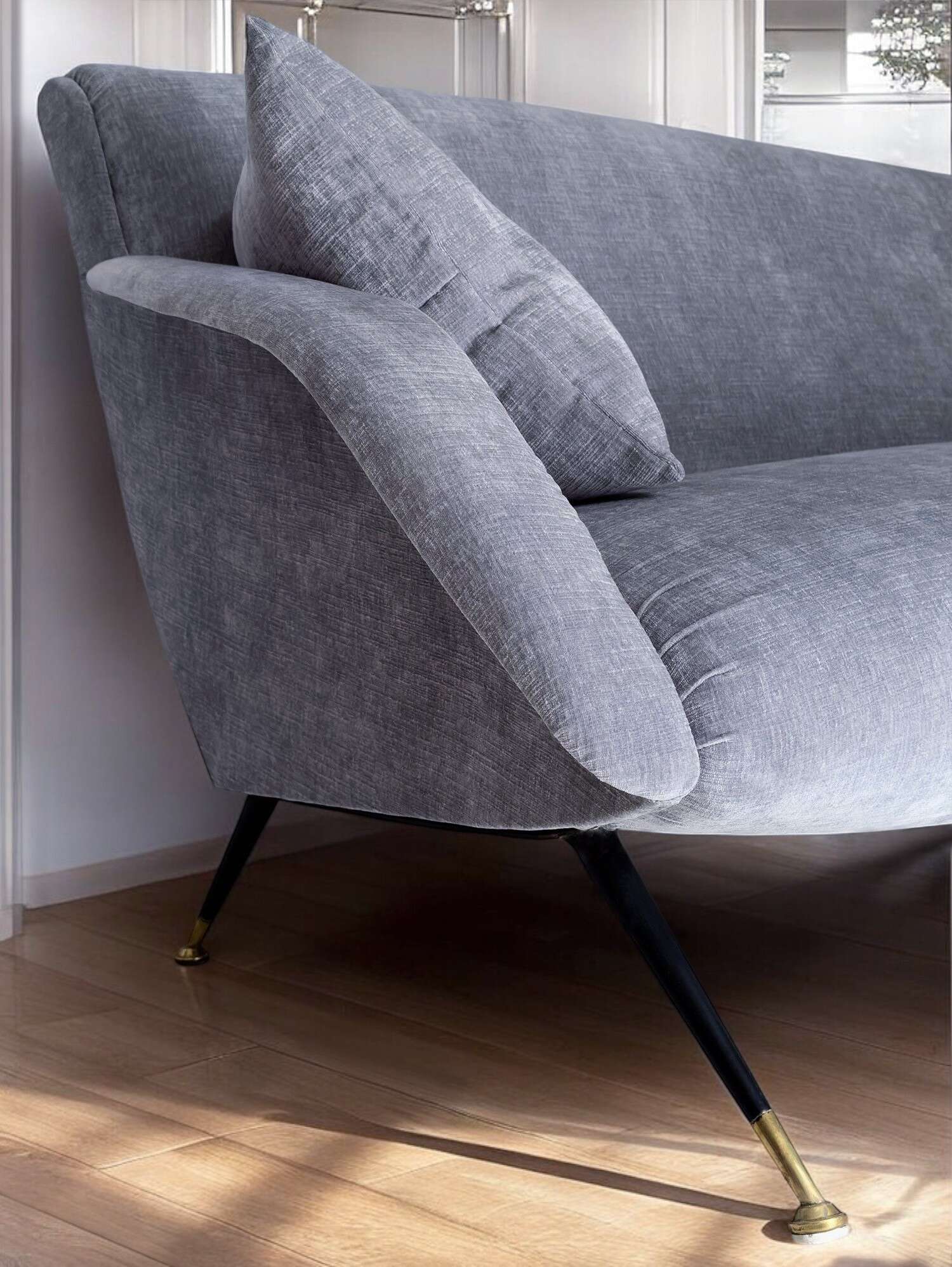 Divano a tre posti con coppia di cuscini, anni '50. Gambe in ferro nero, piedini in ottone e rivestimento in velluto grigio; quest'ultimo è stato sostituito.