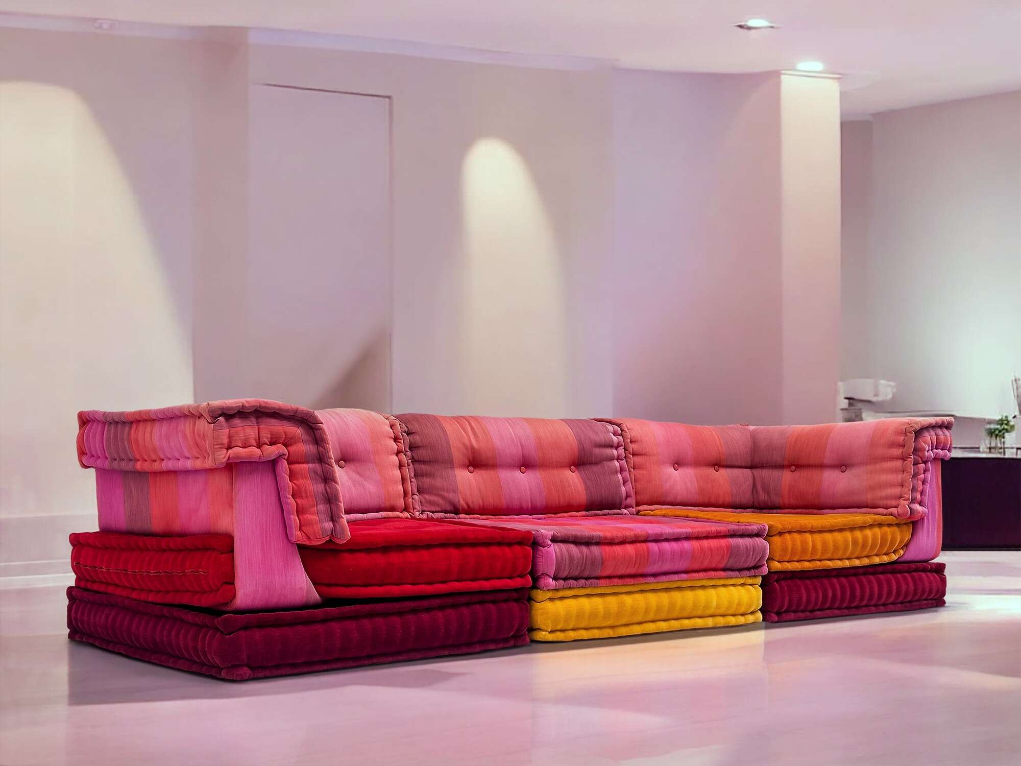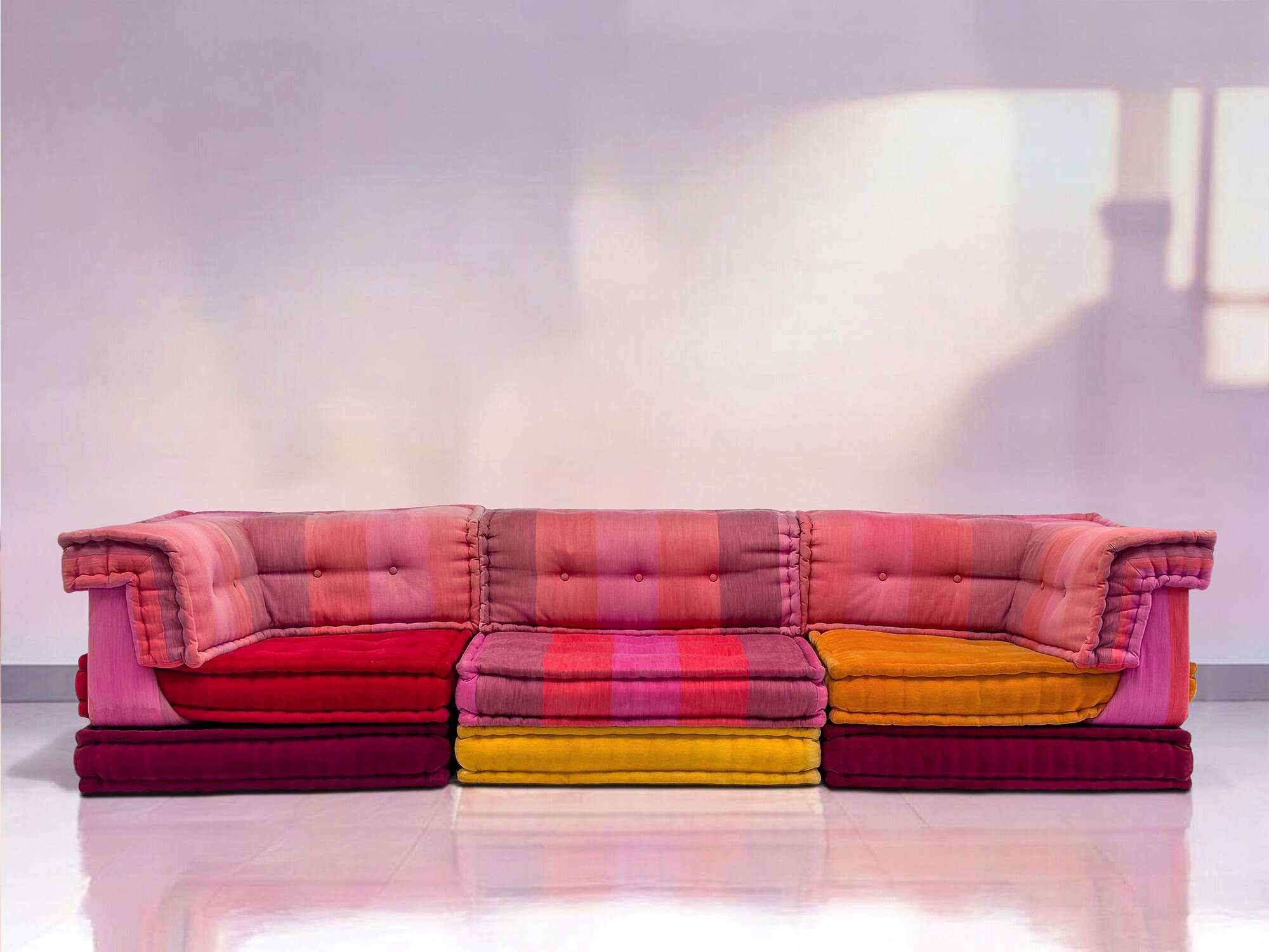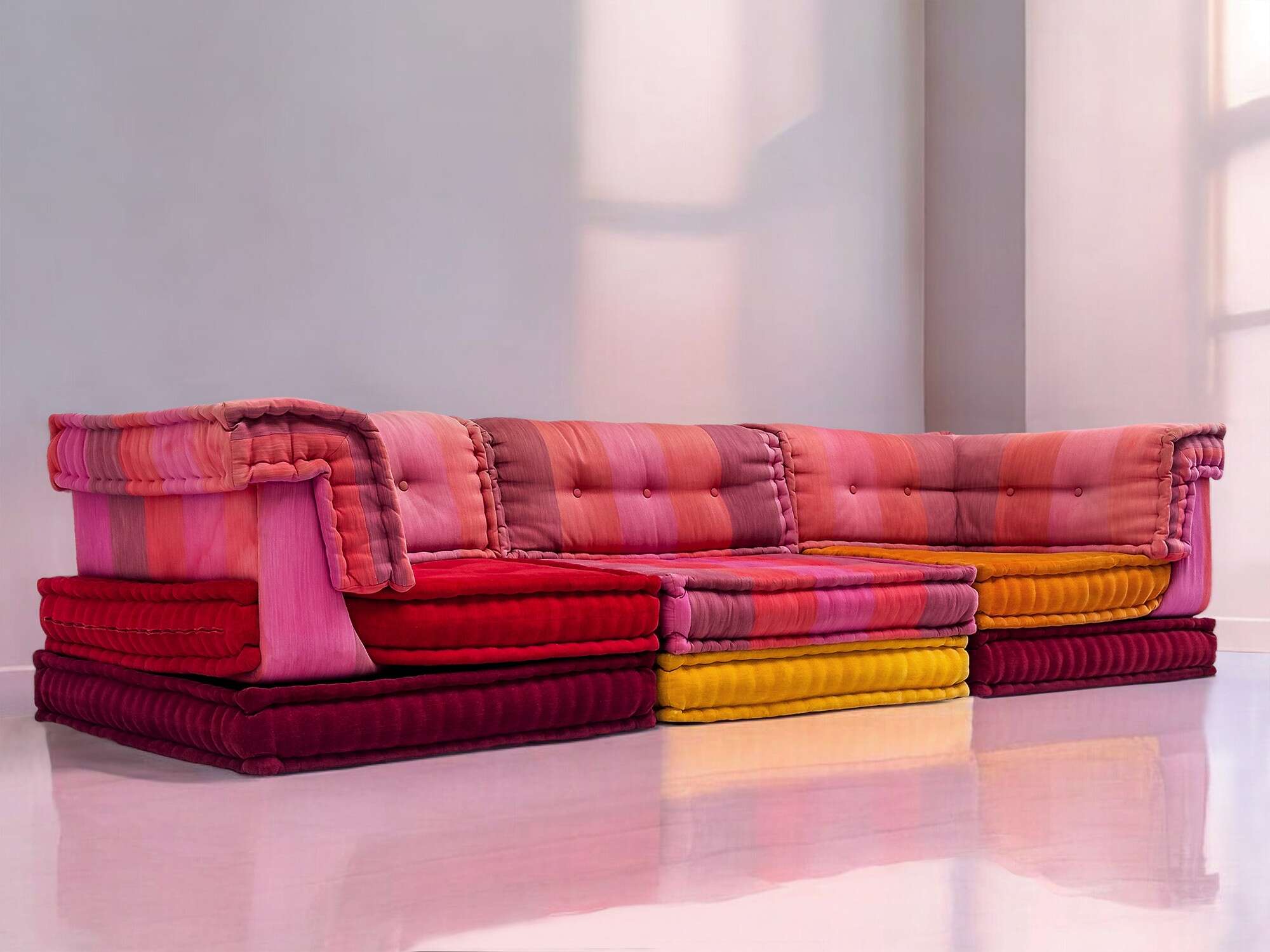 Indulge in the emblem of luxury with the original Mah Jong sofa, decorated with high-quality fabrics designed by Kenzo Takada exclusively for Roche Bobois.